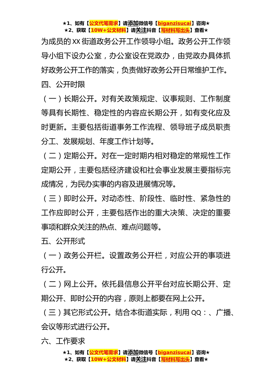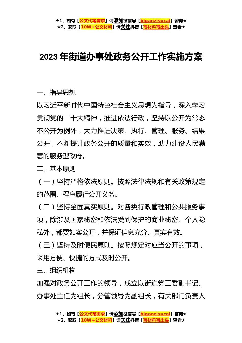 ★1、如有【公文代笔需求】请添加微信号【biganzisucai】咨询★★2、获取【10W+公文材料】请关注抖音【写材料写出头】查看★2023年街道办事处政务公开工作实施方案一、指导思想以习近平新时代中国特色社会主义思想为指导,深入学习贯彻党的二十大精神,推进依法行政,坚持以公开为常态不公开为例外,大力推进决策、执行、管理、服务、结果公开,不断提升政务公开的质量和实效,助力建设人民满意的服务型政府。二、基本原则(一)坚持严格依法原则。按照法律法规和有关政策规定的范围、程序履行公开义务。(二)坚持全面真实原则。对各类行政管理和公共服务事项,除涉及国家秘密和依法受到保护的商业秘密、个人隐私外,都要如实公开,并保证信息充分、真实有效。(三)坚持及时便民原则。按照规定对应当公开的事项...