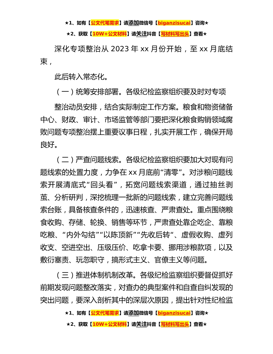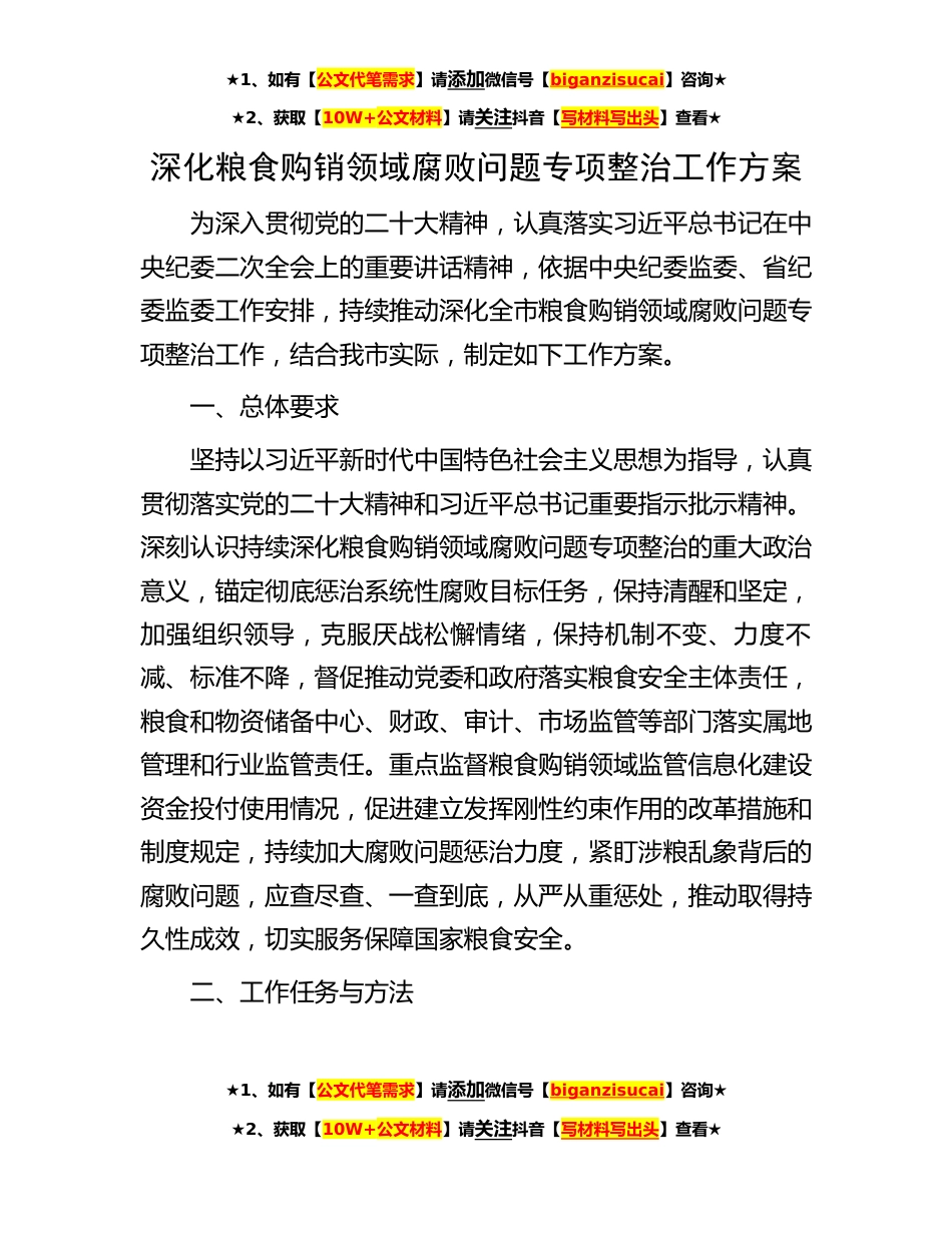 ★1、如有【公文代笔需求】请添加微信号【biganzisucai】咨询★★2、获取【10W+公文材料】请关注抖音【写材料写出头】查看★深化粮食购销领域腐败问题专项整治工作方案为深入贯彻党的二十大精神,认真落实习近平总书记在中央纪委二次全会上的重要讲话精神,依据中央纪委监委、省纪委监委工作安排,持续推动深化全市粮食购销领域腐败问题专项整治工作,结合我市实际,制定如下工作方案。一、总体要求坚持以习近平新时代中国特色社会主义思想为指导,认真贯彻落实党的二十大精神和习近平总书记重要指示批示精神。深刻认识持续深化粮食购销领域腐败问题专项整治的重大政治意义,锚定彻底惩治系统性腐败目标任务,保持清醒和坚定,加强组织领导,克服厌战松懈情绪,保持机制不变、力度不减、标准不降,督促推动党委和...