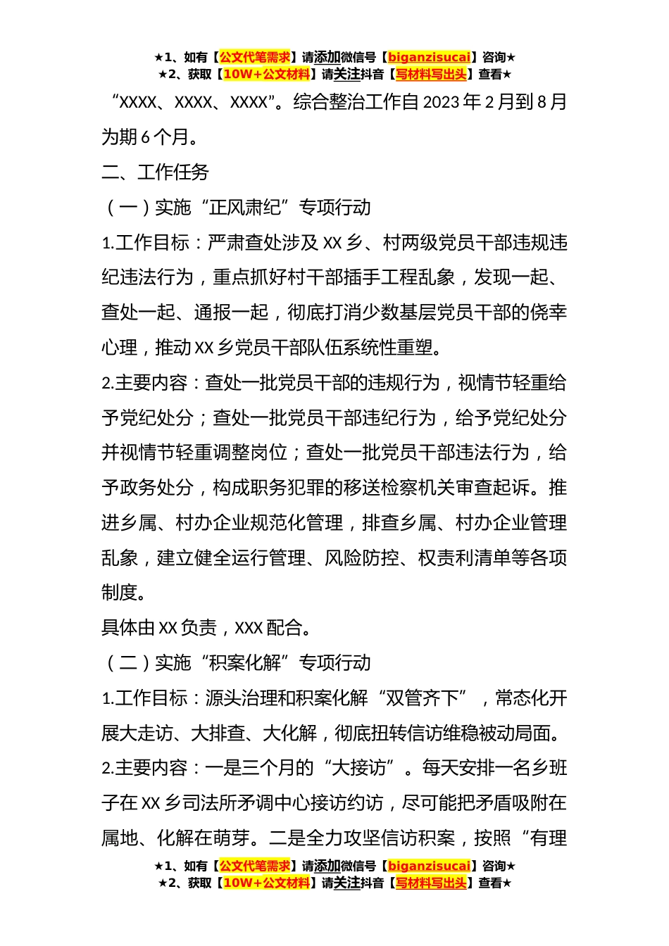 ★1、如有【公文代笔需求】请添加微信号【biganzisucai】咨询★★2、获取【10W+公文材料】请关注抖音【写材料写出头】查看★关于在XX乡综合整治工作实施方案为深入学习贯彻党的XX大精神,按照全省深入实施“八八战略”强力推进创新深化、改革攻坚、开放提升大会和全市领导干部会议暨乡镇党委书记交流会的部署要求,全面落实区委全会、全区干部大会会议精神,进一步凝聚全体乡村干部队伍共识,营造“严纪律、守规矩、转作风”的工作氛围,提振干事创业“精气神”,加快推动XX乡高质量发展。经XX乡党委研究,决定开展“XX乡综合整治”工作。现将有关事项通知如下:一、总体要求以党的XX大精神为指引,围绕区委“四省边际中心城市核心区”“全省共同富裕示范区”建设目标、农村基层“三乱”问题专项整治和全面建强基...