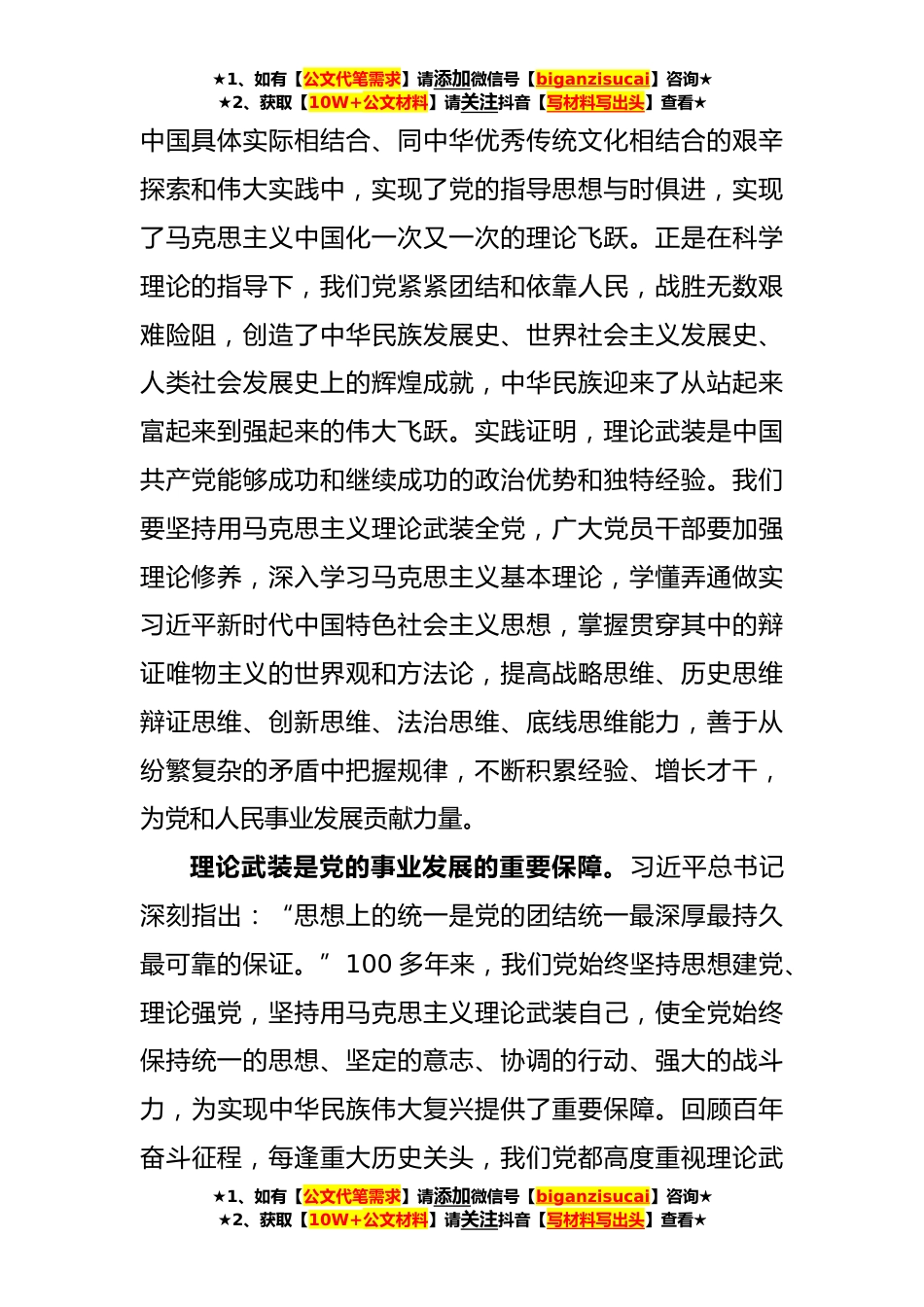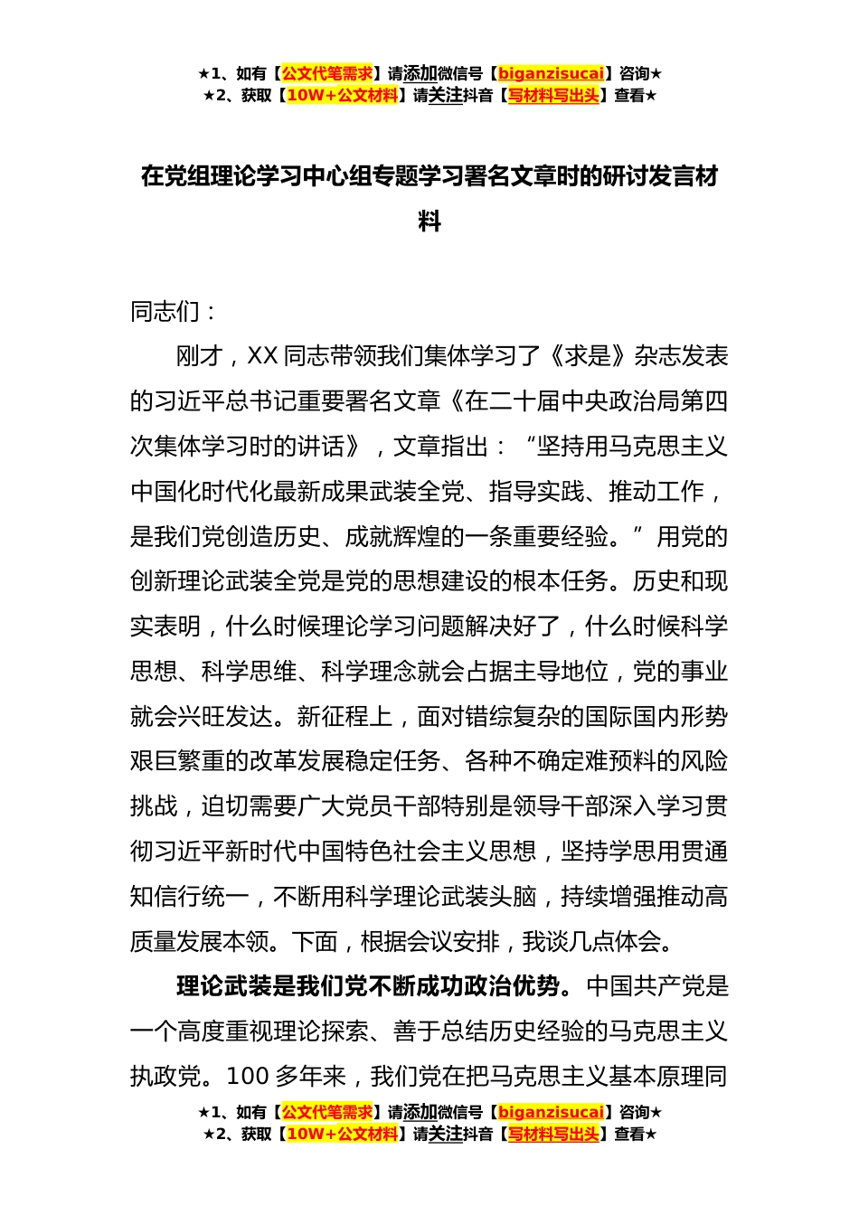 ★1、如有【公文代笔需求】请添加微信号【biganzisucai】咨询★★2、获取【10W+公文材料】请关注抖音【写材料写出头】查看★在党组理论学习中心组专题学习署名文章时的研讨发言材料同志们:刚才,XX同志带领我们集体学习了《求是》杂志发表的习近平总书记重要署名文章《在二十届中央政治局第四次集体学习时的讲话》,文章指出:“坚持用马克思主义中国化时代化最新成果武装全党、指导实践、推动工作,是我们党创造历史、成就辉煌的一条重要经验。”用党的创新理论武装全党是党的思想建设的根本任务。历史和现实表明,什么时候理论学习问题解决好了,什么时候科学思想、科学思维、科学理念就会占据主导地位,党的事业就会兴旺发达。新征程上,面对错综复杂的国际国内形势艰巨繁重的改革发展稳定任务、各种不确定难...