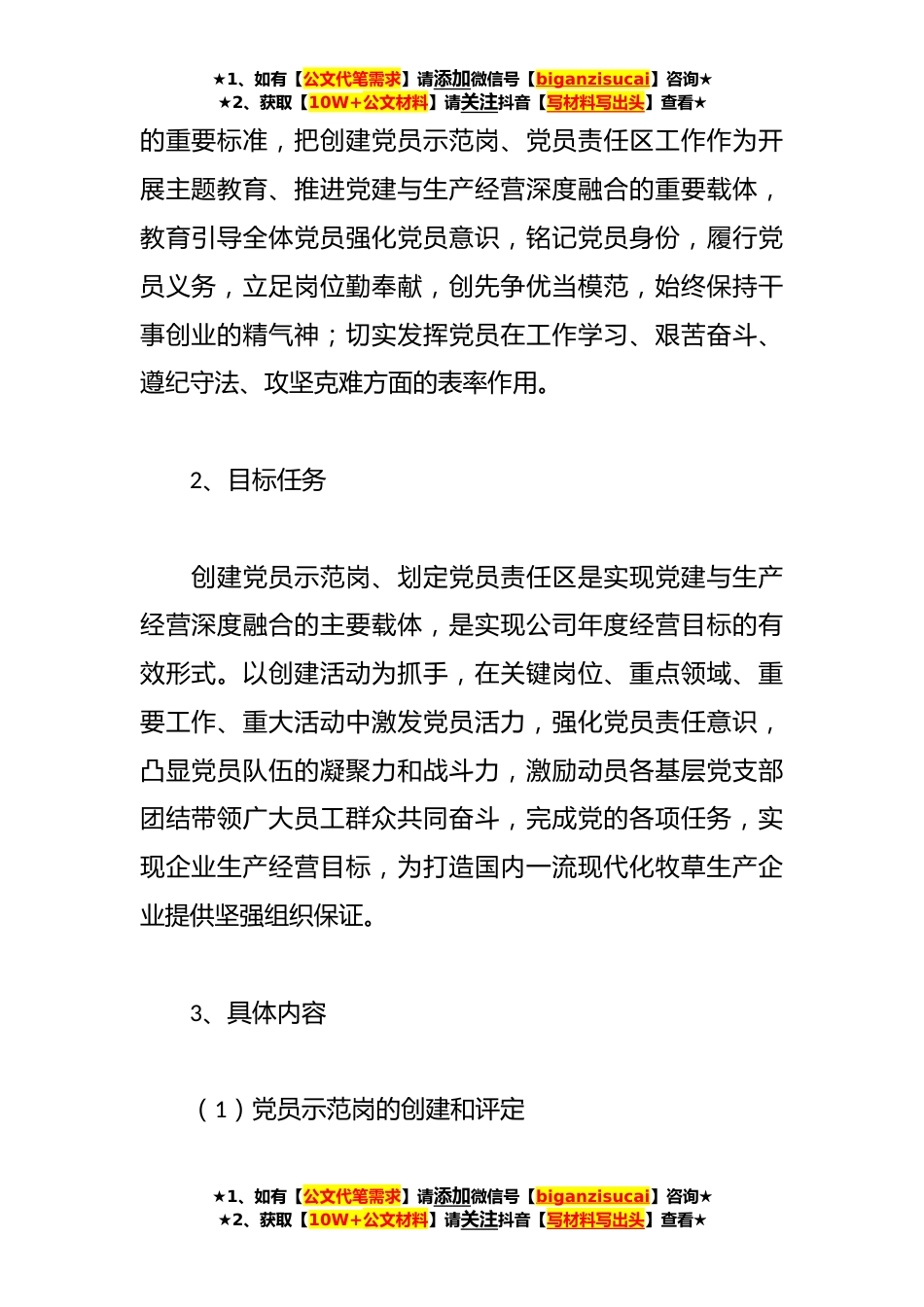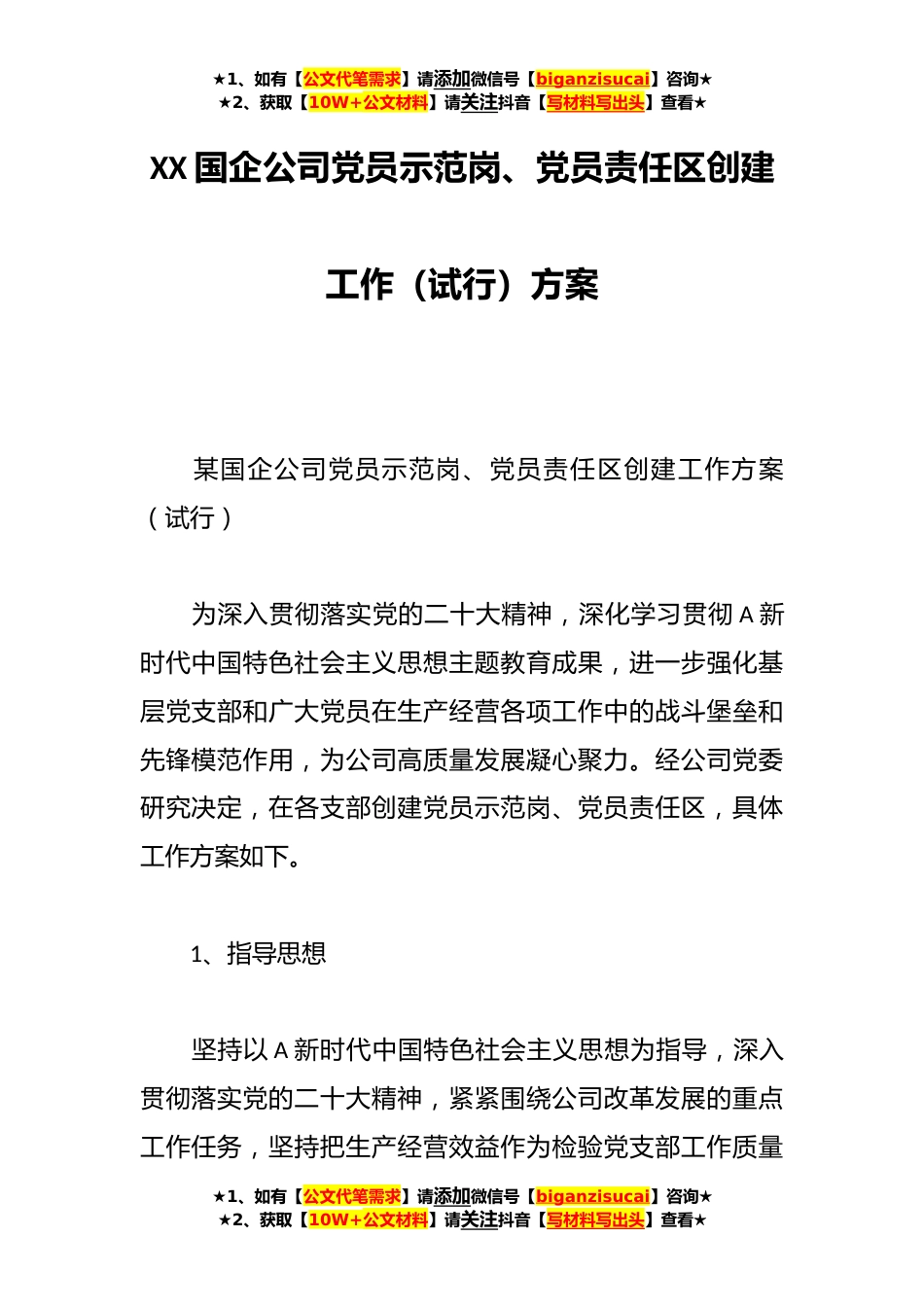 ★1、如有【公文代笔需求】请添加微信号【biganzisucai】咨询★★2、获取【10W+公文材料】请关注抖音【写材料写出头】查看★XX国企公司党员示范岗、党员责任区创建工作(试行)方案某国企公司党员示范岗、党员责任区创建工作方案(试行)为深入贯彻落实党的二十大精神,深化学习贯彻A新时代中国特色社会主义思想主题教育成果,进一步强化基层党支部和广大党员在生产经营各项工作中的战斗堡垒和先锋模范作用,为公司高质量发展凝心聚力。经公司党委研究决定,在各支部创建党员示范岗、党员责任区,具体工作方案如下。1、指导思想坚持以A新时代中国特色社会主义思想为指导,深入贯彻落实党的二十大精神,紧紧围绕公司改革发展的重点工作任务,坚持把生产经营效益作为检验党支部工作质量★1、如有【公文代笔需求】请...