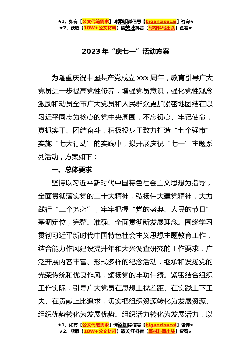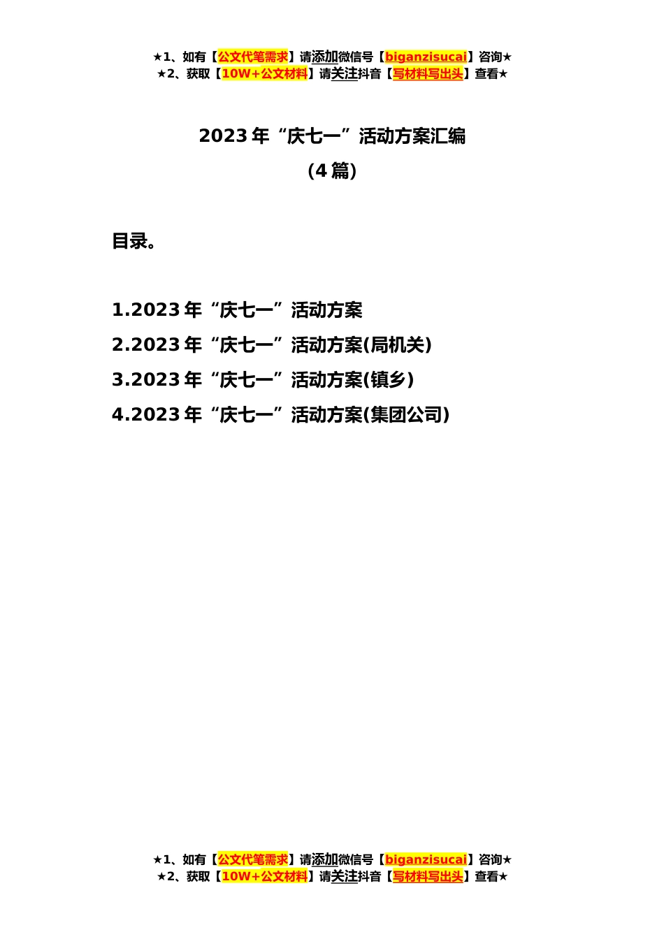 ★1、如有【公文代笔需求】请添加微信号【biganzisucai】咨询★★2、获取【10W+公文材料】请关注抖音【写材料写出头】查看★2023年“庆七一”活动方案汇编(4篇)目录。1.2023年“庆七一”活动方案2.2023年“庆七一”活动方案(局机关)3.2023年“庆七一”活动方案(镇乡)4.2023年“庆七一”活动方案(集团公司)★1、如有【公文代笔需求】请添加微信号【biganzisucai】咨询★★2、获取【10W+公文材料】请关注抖音【写材料写出头】查看★★1、如有【公文代笔需求】请添加微信号【biganzisucai】咨询★★2、获取【10W+公文材料】请关注抖音【写材料写出头】查看★2023年“庆七一”活动方案为隆重庆祝中国共产党成立xxx周年,教育引导广大党员进一步提高党性修养,增强党员意识,强化党性观念激励和动员全市广大党员和人...