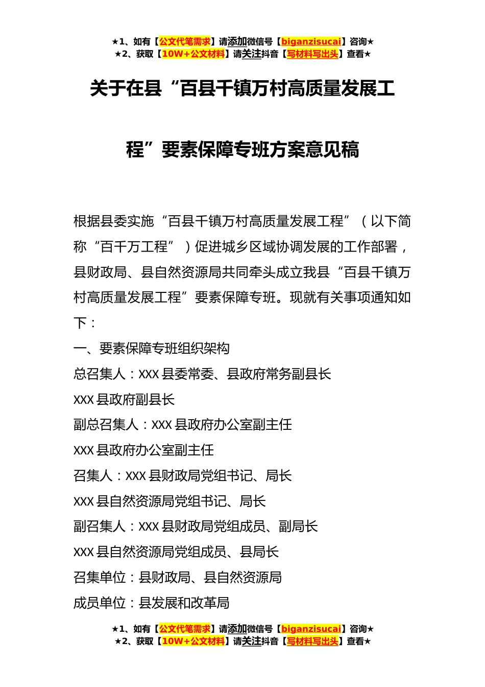 ★1、如有【公文代笔需求】请添加微信号【biganzisucai】咨询★★2、获取【10W+公文材料】请关注抖音【写材料写出头】查看★关于在县“百县千镇万村高质量发展工程”要素保障专班方案意见稿根据县委实施“百县千镇万村高质量发展工程”(以下简称“百千万工程”)促进城乡区域协调发展的工作部署,县财政局、县自然资源局共同牵头成立我县“百县千镇万村高质量发展工程”要素保障专班。现就有关事项通知如下:一、要素保障专班组织架构总召集人:XXX县委常委、县政府常务副县长XXX县政府副县长副总召集人:XXX县政府办公室副主任XXX县政府办公室副主任召集人:XXX县财政局党组书记、局长XXX县自然资源局党组书记、局长副召集人:XXX县财政局党组成员、副局长XXX县自然资源局党组成员、县局长召集单位:县财政局、...