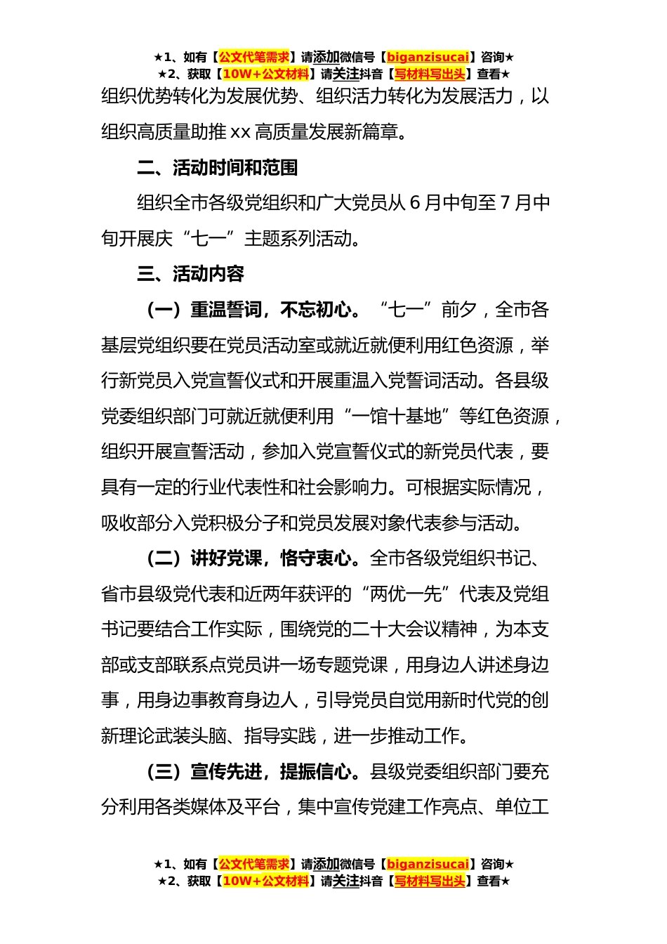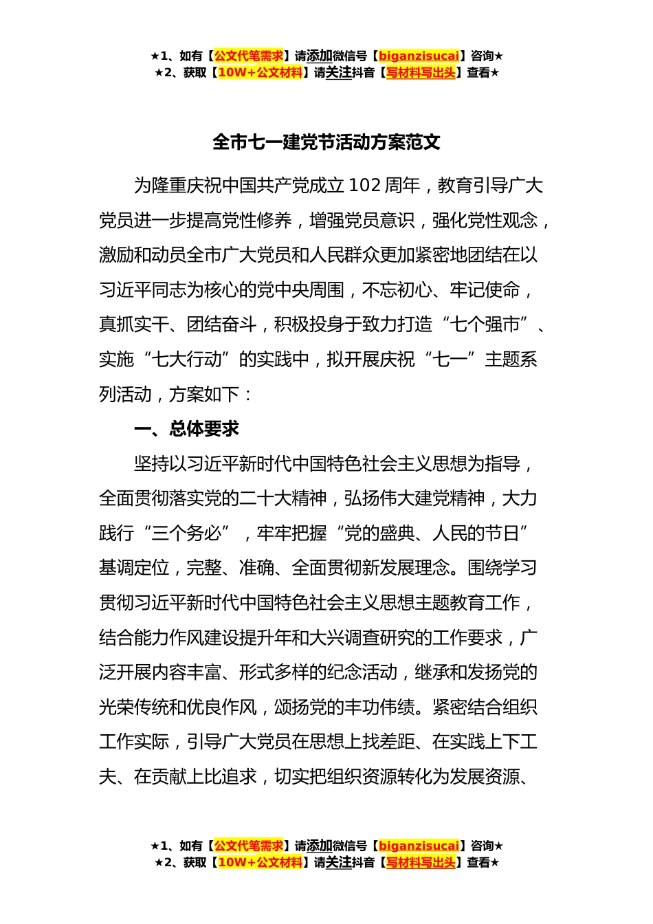 ★1、如有【公文代笔需求】请添加微信号【biganzisucai】咨询★★2、获取【10W+公文材料】请关注抖音【写材料写出头】查看★全市七一建党节活动方案范文为隆重庆祝中国共产党成立102周年,教育引导广大党员进一步提高党性修养,增强党员意识,强化党性观念,激励和动员全市广大党员和人民群众更加紧密地团结在以习近平同志为核心的党中央周围,不忘初心、牢记使命,真抓实干、团结奋斗,积极投身于致力打造“七个强市”、实施“七大行动”的实践中,拟开展庆祝“七一”主题系列活动,方案如下:一、总体要求坚持以习近平新时代中国特色社会主义思想为指导,全面贯彻落实党的二十大精神,弘扬伟大建党精神,大力践行“三个务必”,牢牢把握“党的盛典、人民的节日”基调定位,完整、准确、全面贯彻新发展理念。围绕...