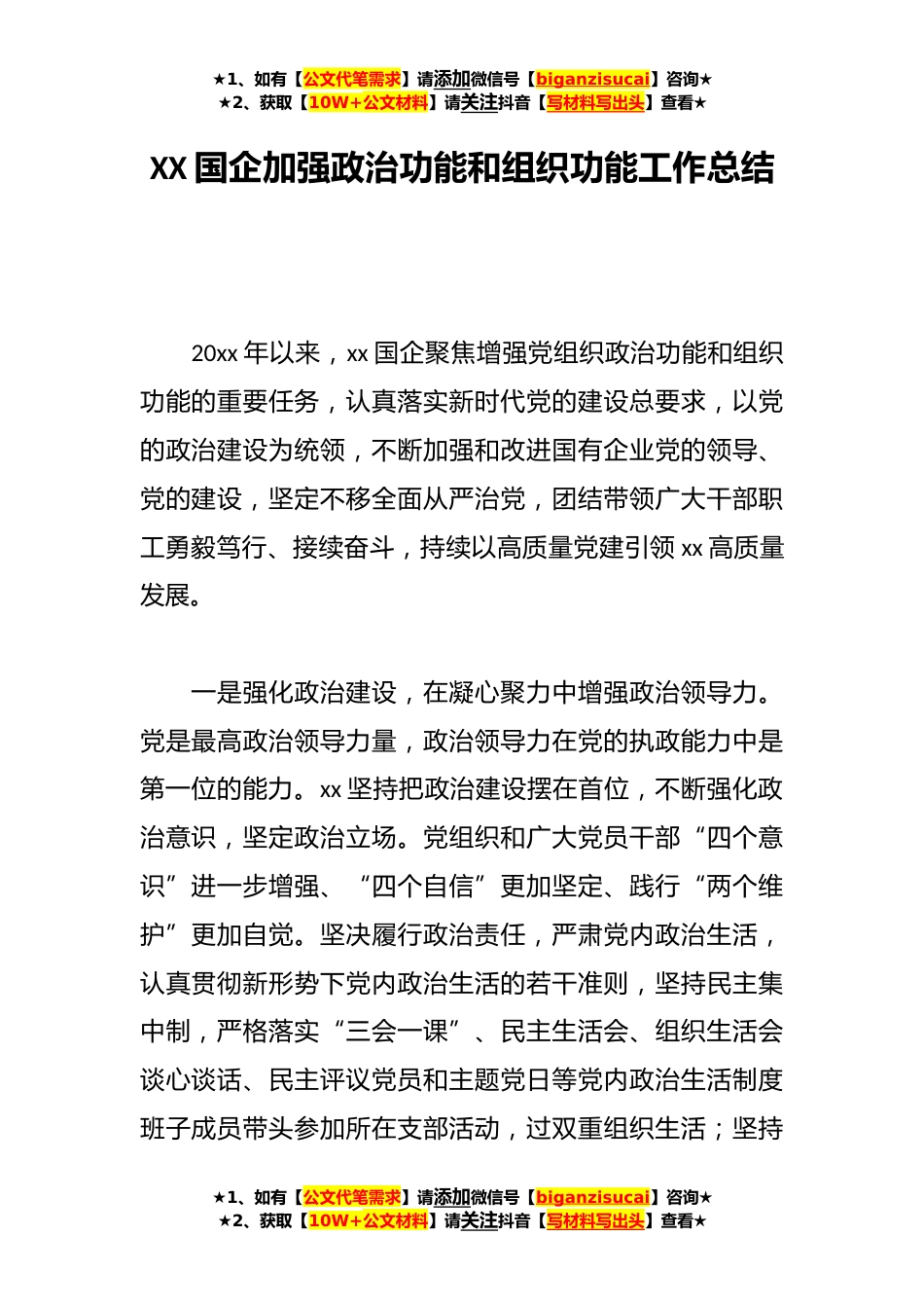 ★1、如有【公文代笔需求】请添加微信号【biganzisucai】咨询★★2、获取【10W+公文材料】请关注抖音【写材料写出头】查看★XX国企加强政治功能和组织功能工作总结20xx年以来,xx国企聚焦增强党组织政治功能和组织功能的重要任务,认真落实新时代党的建设总要求,以党的政治建设为统领,不断加强和改进国有企业党的领导、党的建设,坚定不移全面从严治党,团结带领广大干部职工勇毅笃行、接续奋斗,持续以高质量党建引领xx高质量发展。一是强化政治建设,在凝心聚力中增强政治领导力。党是最高政治领导力量,政治领导力在党的执政能力中是第一位的能力。xx坚持把政治建设摆在首位,不断强化政治意识,坚定政治立场。党组织和广大党员干部“四个意识”进一步增强、“四个自信”更加坚定、践行“两个维护”更加自觉...