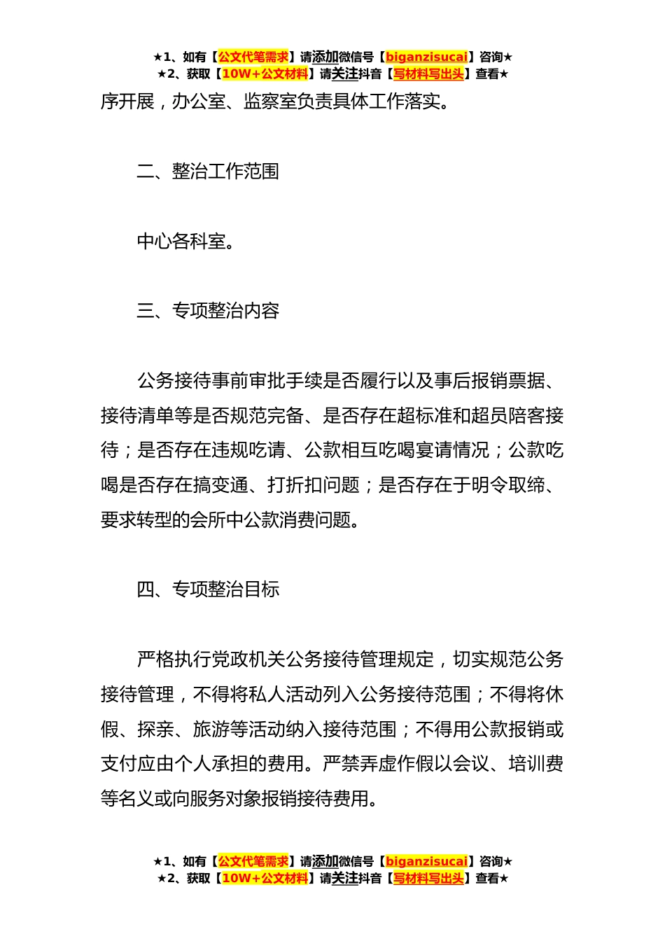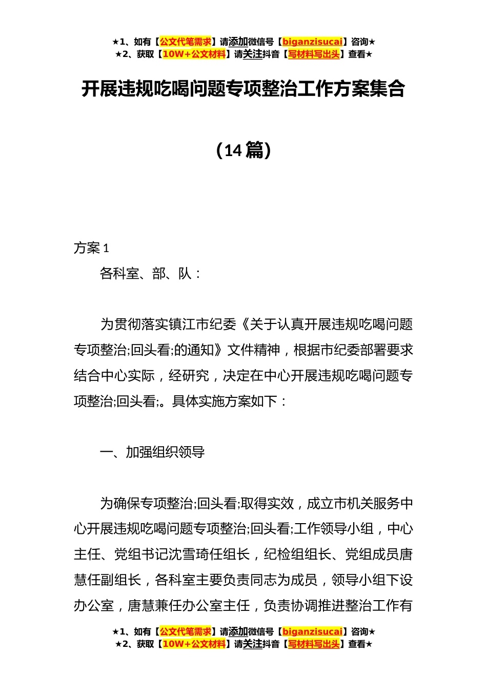 ★1、如有【公文代笔需求】请添加微信号【biganzisucai】咨询★★2、获取【10W+公文材料】请关注抖音【写材料写出头】查看★开展违规吃喝问题专项整治工作方案集合(14篇)方案1各科室、部、队:为贯彻落实镇江市纪委《关于认真开展违规吃喝问题专项整治;回头看;的通知》文件精神,根据市纪委部署要求结合中心实际,经研究,决定在中心开展违规吃喝问题专项整治;回头看;。具体实施方案如下:一、加强组织领导为确保专项整治;回头看;取得实效,成立市机关服务中心开展违规吃喝问题专项整治;回头看;工作领导小组,中心主任、党组书记沈雪琦任组长,纪检组组长、党组成员唐慧任副组长,各科室主要负责同志为成员,领导小组下设办公室,唐慧兼任办公室主任,负责协调推进整治工作有★1、如有【公文代笔需求】请添加微...