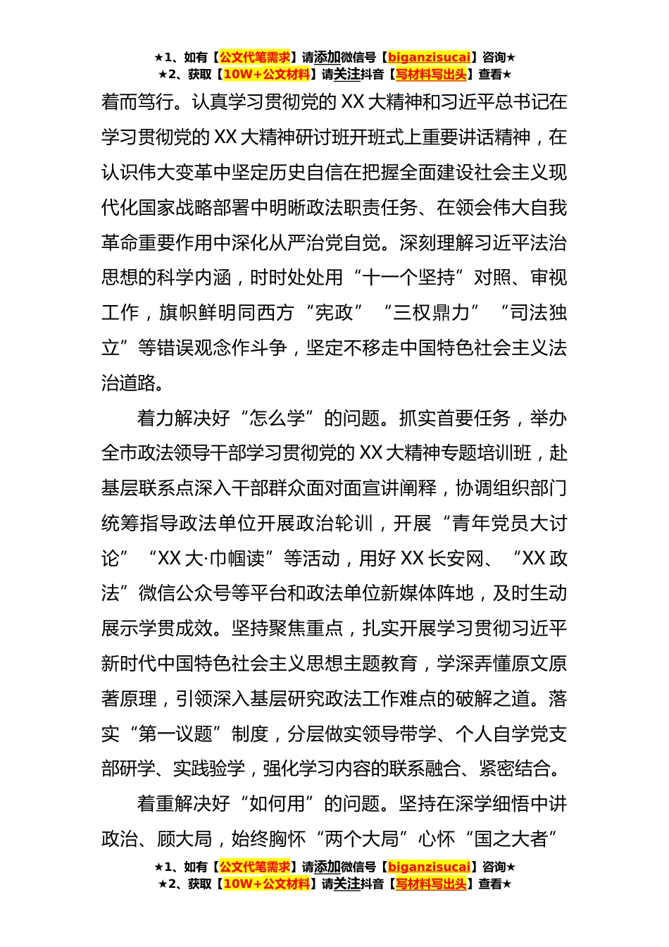 ★1、如有【公文代笔需求】请添加微信号【biganzisucai】咨询★★2、获取【10W+公文材料】请关注抖音【写材料写出头】查看★在2023年政法委第一期专题读书班上的讲话同志们:习近平总书记在党的XX大报告中对法治建设、维护国家安全和社会稳定分别作了专章论述、专门部署,为推进新时代新征程政法工作现代化举旗定向。市委政法委全体党员干部认真学习贯彻党的XX大精神,牢牢把握政治机关属性,强化管党治党政治责任,坚持“忠专实”“勤正廉”,奋力推动高质量党建和政法工作现代化相互促进有机结合,为加快建设现代化美好XX作出积极贡献。下面,我讲几点意见。一、坚持固本培元,筑牢政法姓党思想根基党的XX大报告强调“坚持不懈用新时代中国特色社会主义思想凝心铸魂”。市委政法委作为市委领导和管理全市政法工...