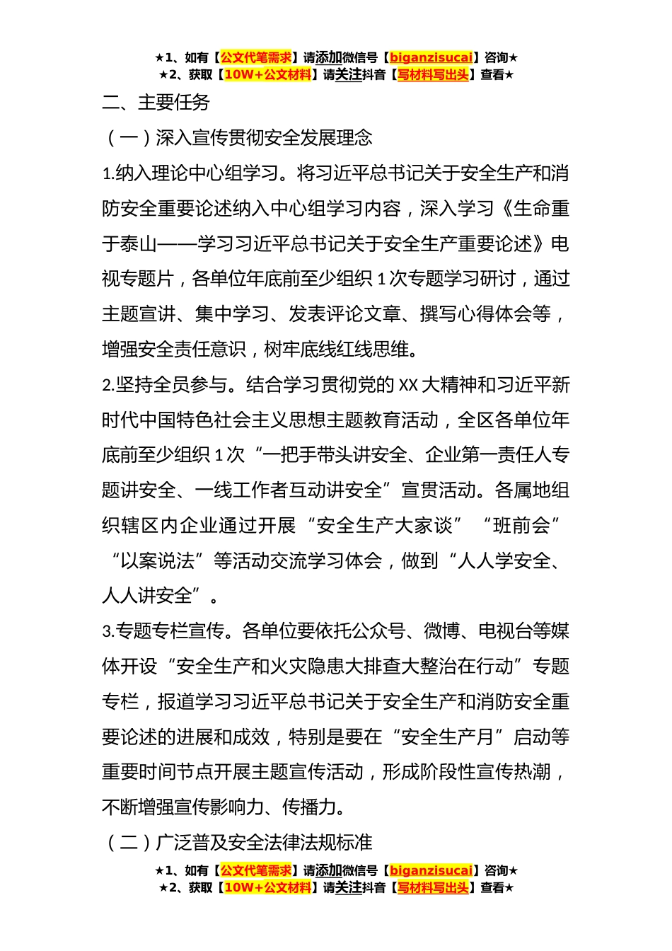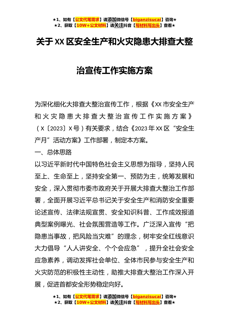 ★1、如有【公文代笔需求】请添加微信号【biganzisucai】咨询★★2、获取【10W+公文材料】请关注抖音【写材料写出头】查看★关于XX区安全生产和火灾隐患大排查大整治宣传工作实施方案为深化细化大排查大整治宣传工作,根据《XX市安全生产和火灾隐患大排查大整治宣传工作实施方案》(X〔2023〕X号)有关要求,结合《2023年XX区“安全生产月”活动方案》工作部署,制定本方案。一、总体思路以习近平新时代中国特色社会主义思想为指导,坚持人民至上、生命至上,坚持安全第一、预防为主,统筹发展和安全,深入贯彻市委市政府关于开展大排查大整治工作部署,全面开展习近平总书记关于安全生产和消防安全重要论述宣传、法律法规宣贯、安全知识科普、工作成效报道典型案例曝光、社会氛围营造等工作。广泛深入宣传“把隐...