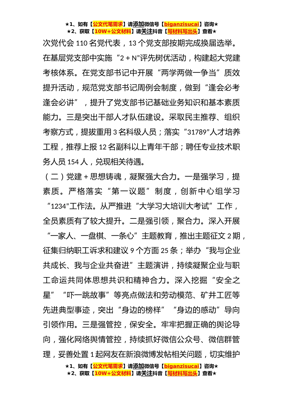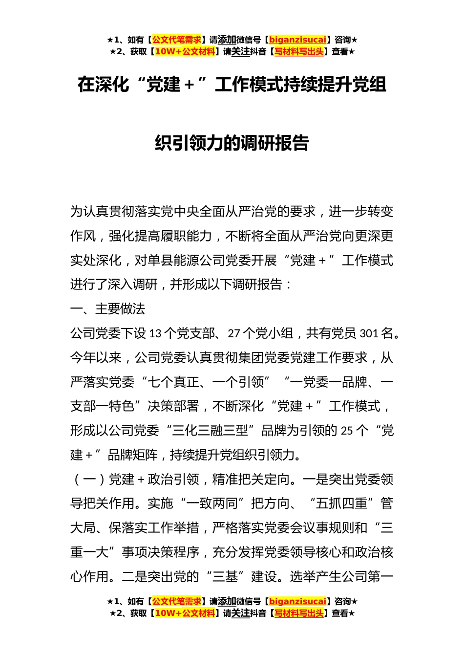 ★1、如有【公文代笔需求】请添加微信号【biganzisucai】咨询★★2、获取【10W+公文材料】请关注抖音【写材料写出头】查看★在深化“党建+”工作模式持续提升党组织引领力的调研报告为认真贯彻落实党中央全面从严治党的要求,进一步转变作风,强化提高履职能力,不断将全面从严治党向更深更实处深化,对单县能源公司党委开展“党建+”工作模式进行了深入调研,并形成以下调研报告:一、主要做法公司党委下设13个党支部、27个党小组,共有党员301名。今年以来,公司党委认真贯彻集团党委党建工作要求,从严落实党委“七个真正、一个引领”“一党委一品牌、一支部一特色”决策部署,不断深化“党建+”工作模式,形成以公司党委“三化三融三型”品牌为引领的25个“党建+”品牌矩阵,持续提升党组织引领力。(一)...
