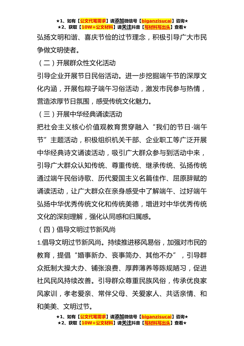 ★1、如有【公文代笔需求】请添加微信号【biganzisucai】咨询★★2、获取【10W+公文材料】请关注抖音【写材料写出头】查看★2023年某局关于“我们的节日·端午节”文明实践主题活动方案一、指导思想认真贯彻落实习近平总书记系列重要讲话精神、党的XX大精神,及省、XX市精神文明建设相关要求,培育和践行社会主义核心价值观,大力弘扬以爱国主义为核心的民族精神,围绕端午节民间习俗和文化内涵,开展形式多样、健康向上的节日活动,充分挖掘端午节的浓厚文化内涵,引导群众进一步了解传统节日,认同传统节日,过好传统节日,增强广大群众的价值认同、文化自信、爱国情怀,为“强省会”建设提供精神动力和道德滋养。二、活动主题浓情端午传承文明三、活动安排(一)开展各类新时代文明实践志愿服务活动以端午节为...