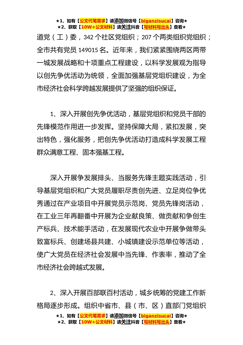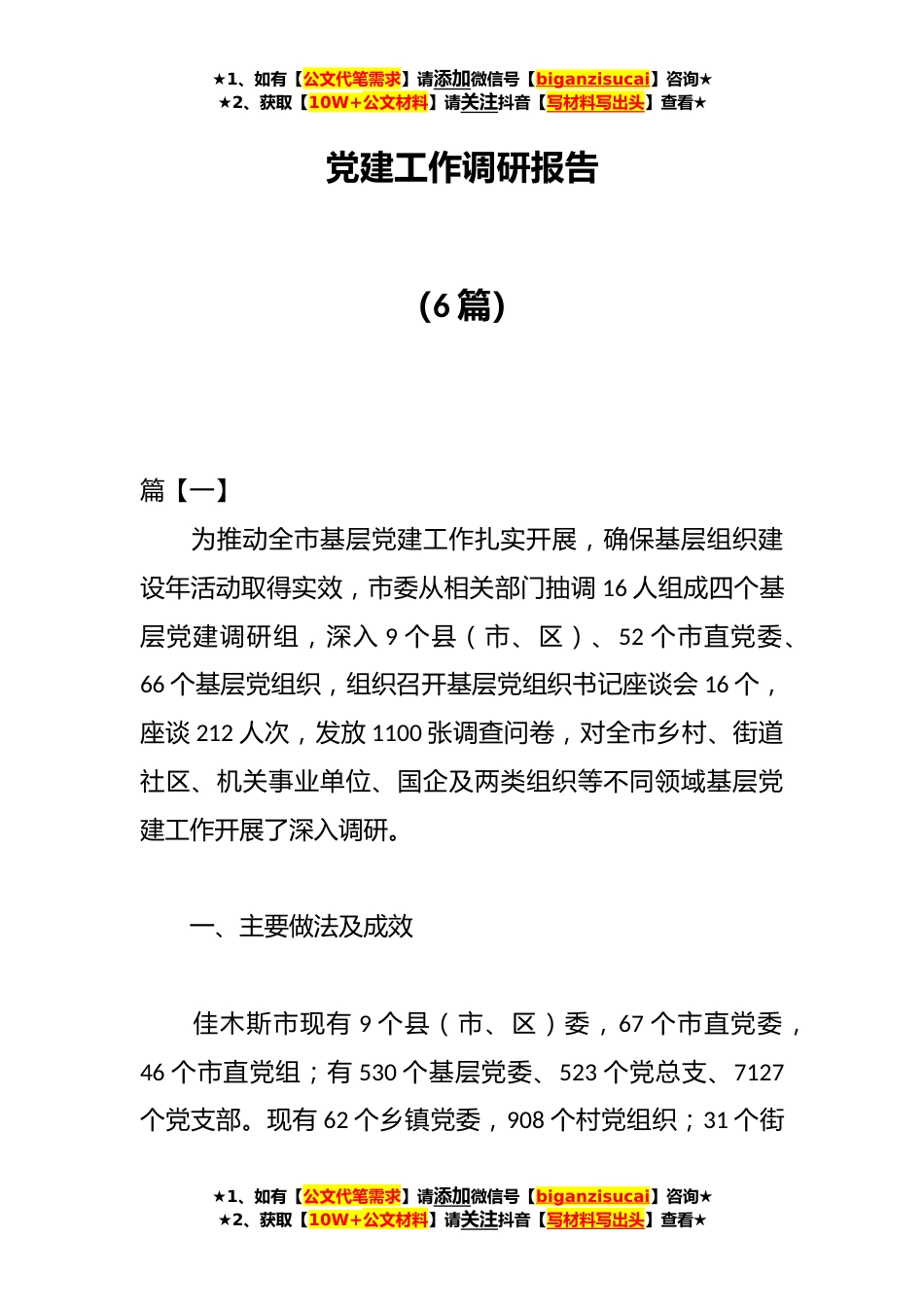 ★1、如有【公文代笔需求】请添加微信号【biganzisucai】咨询★★2、获取【10W+公文材料】请关注抖音【写材料写出头】查看★党建工作调研报告(6篇)篇【一】为推动全市基层党建工作扎实开展,确保基层组织建设年活动取得实效,市委从相关部门抽调16人组成四个基层党建调研组,深入9个县(市、区)、52个市直党委、66个基层党组织,组织召开基层党组织书记座谈会16个,座谈212人次,发放1100张调查问卷,对全市乡村、街道社区、机关事业单位、国企及两类组织等不同领域基层党建工作开展了深入调研。一、主要做法及成效佳木斯市现有9个县(市、区)委,67个市直党委,46个市直党组;有530个基层党委、523个党总支、7127个党支部。现有62个乡镇党委,908个村党组织;31个街★1、如有【公文代笔需求】请添加微信号【b...