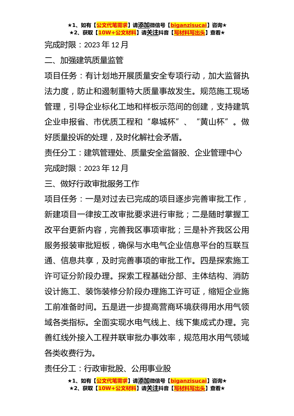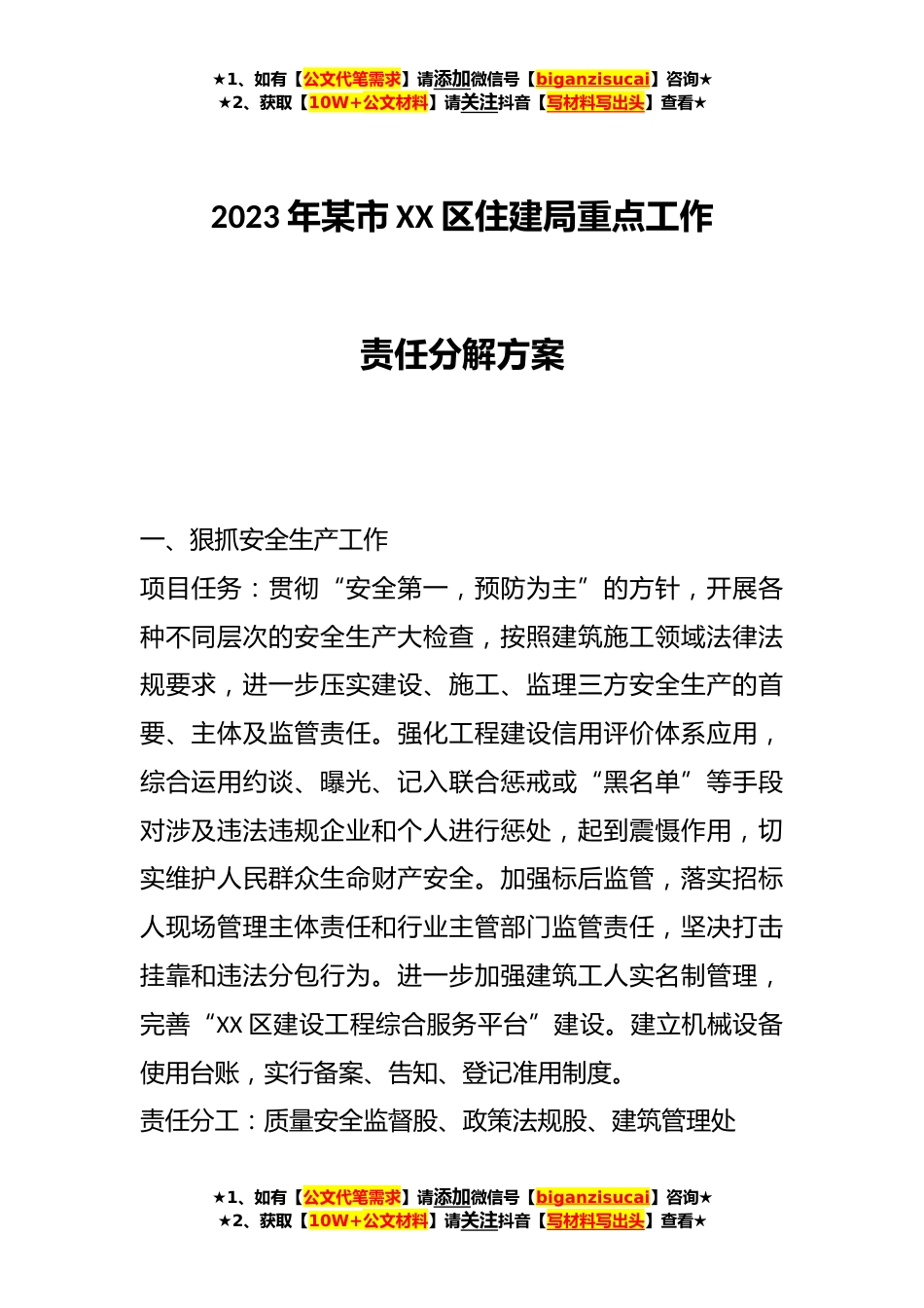 ★1、如有【公文代笔需求】请添加微信号【biganzisucai】咨询★★2、获取【10W+公文材料】请关注抖音【写材料写出头】查看★2023年某市XX区住建局重点工作责任分解方案一、狠抓安全生产工作项目任务:贯彻“安全第一,预防为主”的方针,开展各种不同层次的安全生产大检查,按照建筑施工领域法律法规要求,进一步压实建设、施工、监理三方安全生产的首要、主体及监管责任。强化工程建设信用评价体系应用,综合运用约谈、曝光、记入联合惩戒或“黑名单”等手段对涉及违法违规企业和个人进行惩处,起到震慑作用,切实维护人民群众生命财产安全。加强标后监管,落实招标人现场管理主体责任和行业主管部门监管责任,坚决打击挂靠和违法分包行为。进一步加强建筑工人实名制管理,完善“XX区建设工程综合服务平台”建设...
