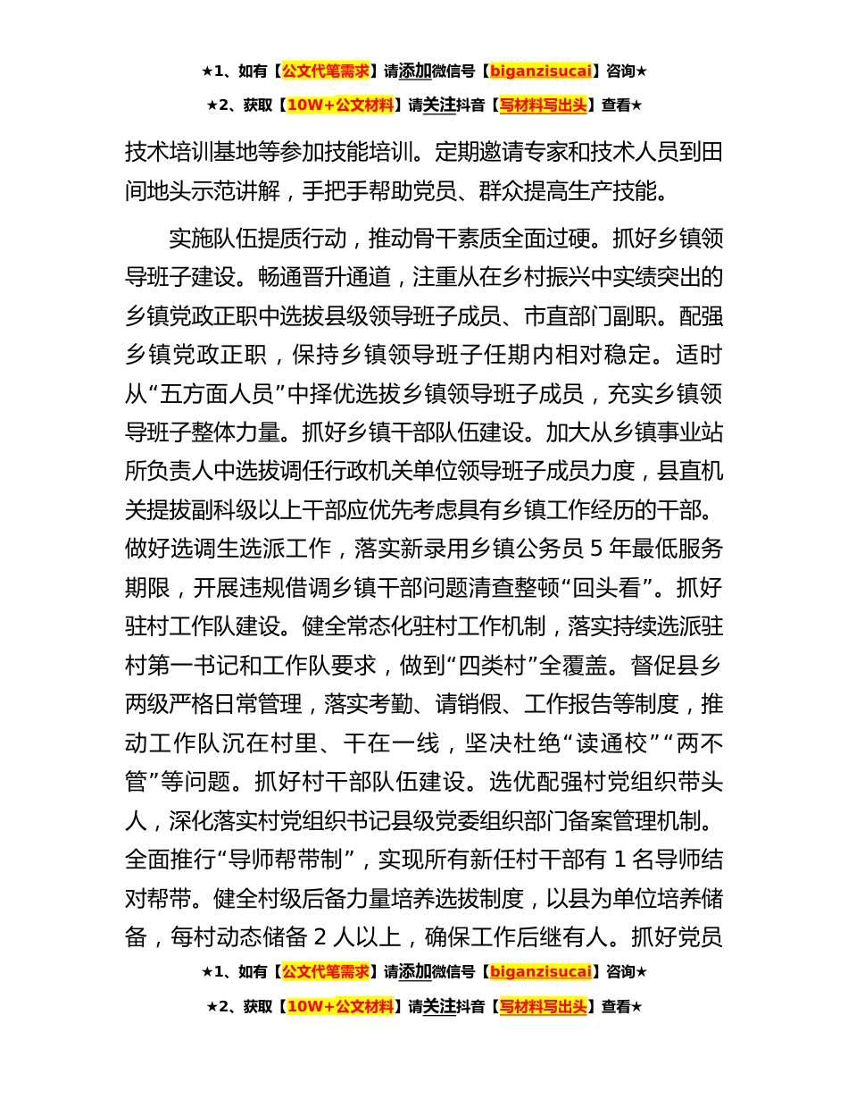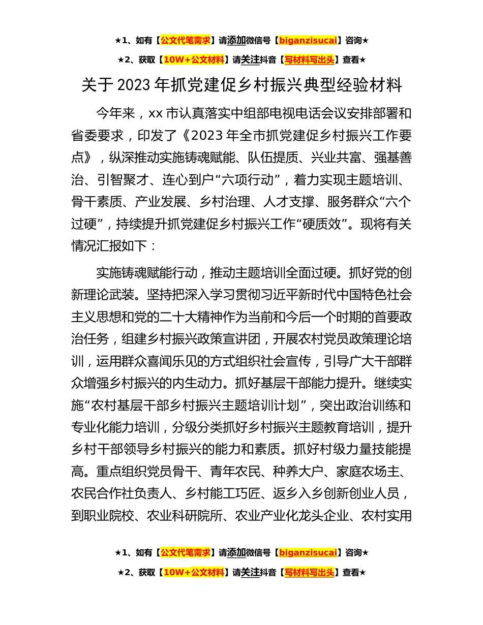 ★1、如有【公文代笔需求】请添加微信号【biganzisucai】咨询★★2、获取【10W+公文材料】请关注抖音【写材料写出头】查看★关于2023年抓党建促乡村振兴典型经验材料今年来,xx市认真落实中组部电视电话会议安排部署和省委要求,印发了《2023年全市抓党建促乡村振兴工作要点》,纵深推动实施铸魂赋能、队伍提质、兴业共富、强基善“”治、引智聚才、连心到户六项行动,着力实现主题培训、“骨干素质、产业发展、乡村治理、人才支撑、服务群众六个”“”过硬,持续提升抓党建促乡村振兴工作硬质效。现将有关情况汇报如下:实施铸魂赋能行动,推动主题培训全面过硬。抓好党的创新理论武装。坚持把深入学习贯彻习近平新时代中国特色社会主义思想和党的二十大精神作为当前和今后一个时期的首要政治任务,组建乡村振兴...