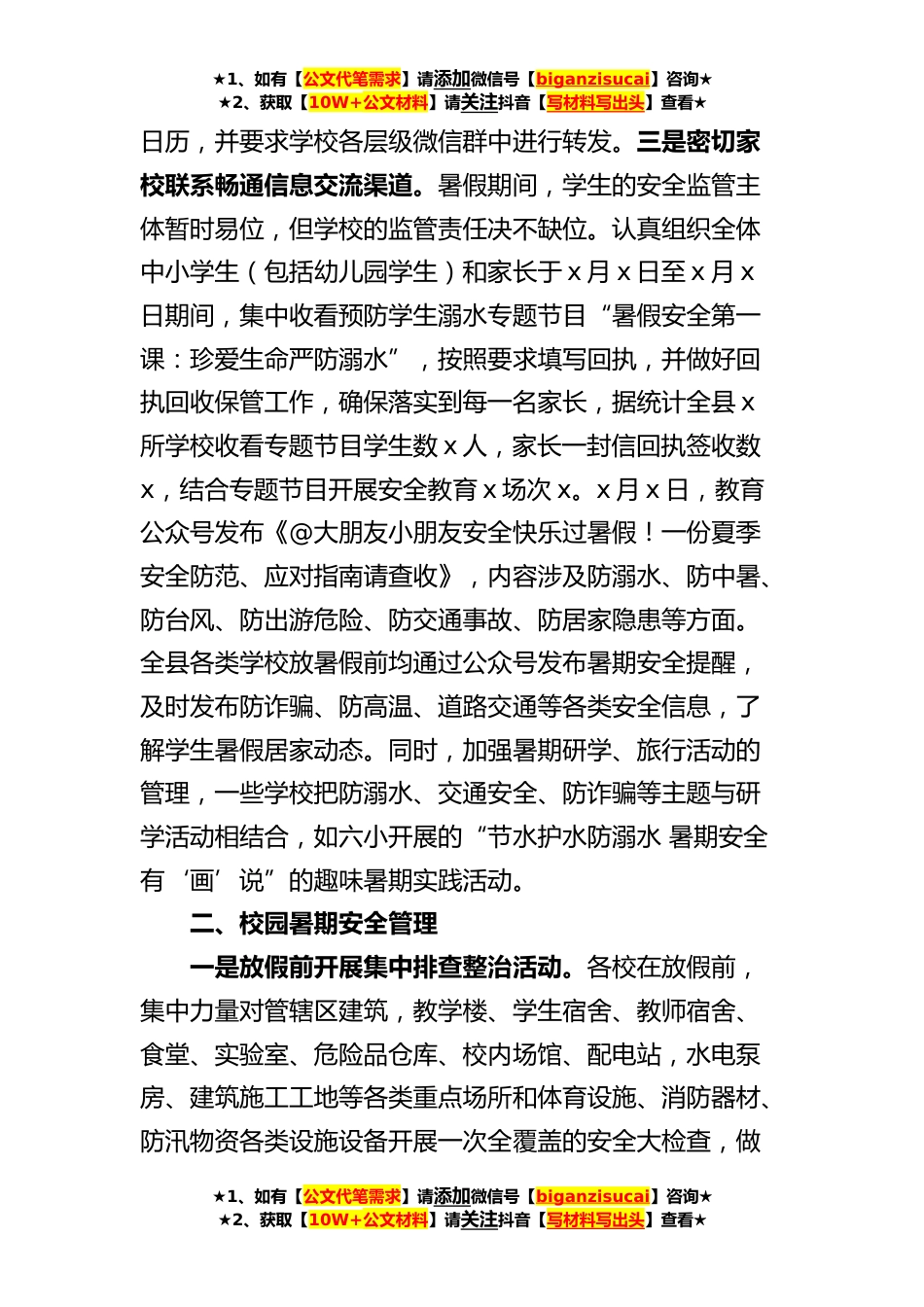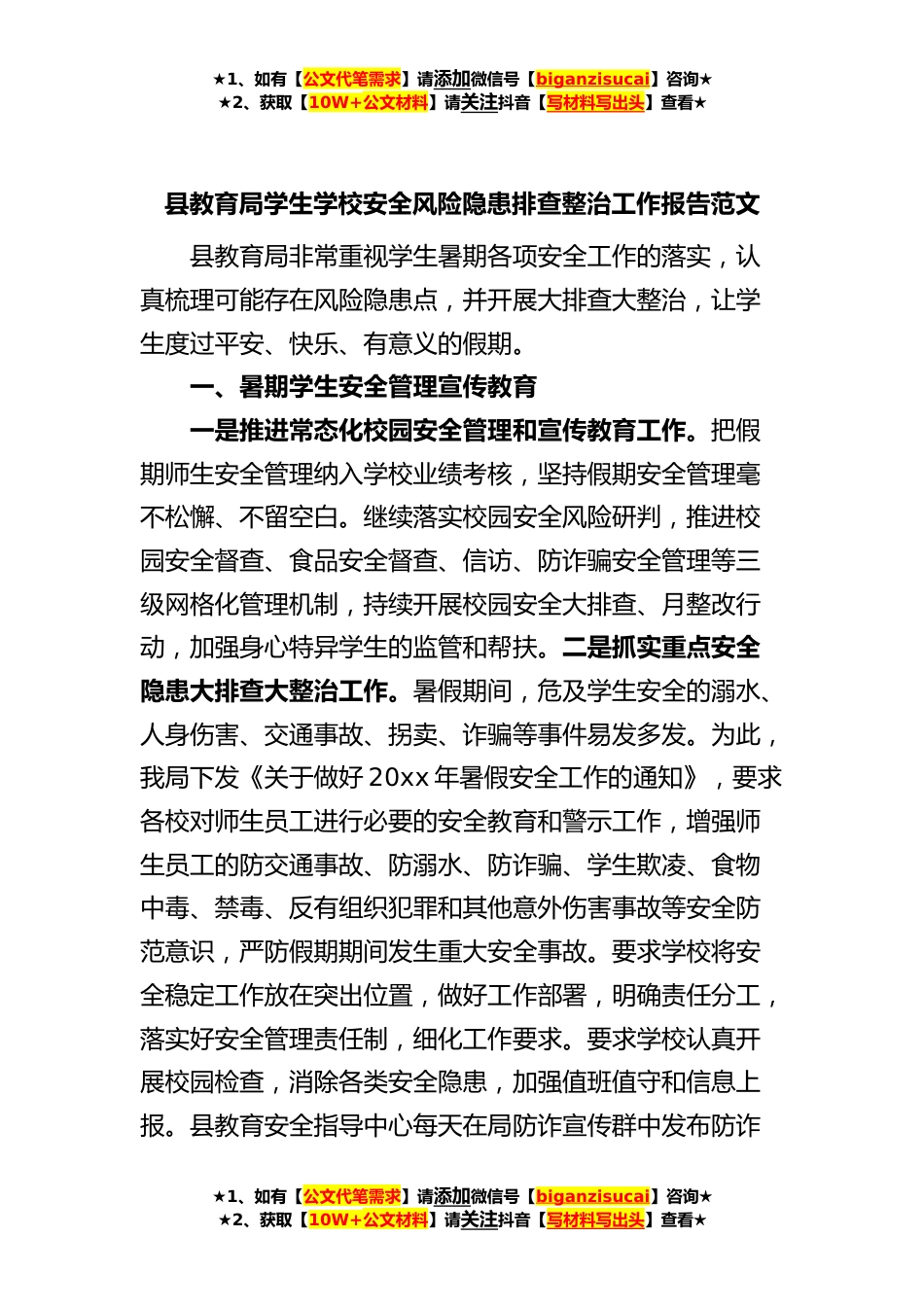 ★1、如有【公文代笔需求】请添加微信号【biganzisucai】咨询★★2、获取【10W+公文材料】请关注抖音【写材料写出头】查看★县教育局学生学校安全风险隐患排查整治工作报告范文县教育局非常重视学生暑期各项安全工作的落实,认真梳理可能存在风险隐患点,并开展大排查大整治,让学生度过平安、快乐、有意义的假期。一、暑期学生安全管理宣传教育一是推进常态化校园安全管理和宣传教育工作。把假期师生安全管理纳入学校业绩考核,坚持假期安全管理毫不松懈、不留空白。继续落实校园安全风险研判,推进校园安全督查、食品安全督查、信访、防诈骗安全管理等三级网格化管理机制,持续开展校园安全大排查、月整改行动,加强身心特异学生的监管和帮扶。二是抓实重点安全隐患大排查大整治工作。暑假期间,危及学生安全的...
