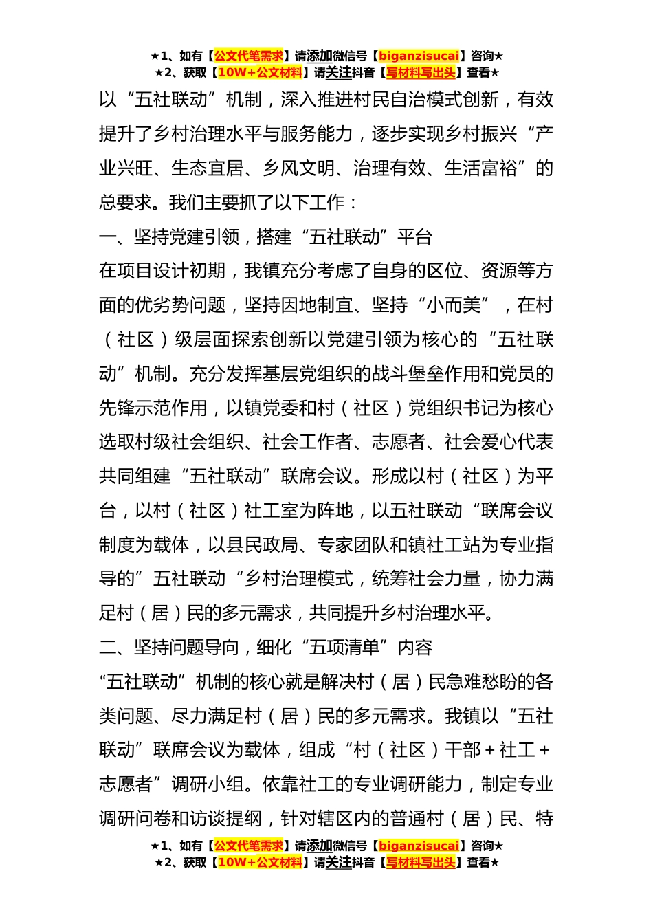 ★1、如有【公文代笔需求】请添加微信号【biganzisucai】咨询★★2、获取【10W+公文材料】请关注抖音【写材料写出头】查看★关于镇党委书记在全省乡村振兴经验交流会上关于“五社联动”的发言“五社联动”机制是指充分统筹、协调并积极发挥村(社区)、社会工作者、社区社会组织、志愿者、社会公益慈善资源这五个要素的优势和积极性,共同组成社会关爱服务体系,并以项目化的形式进一步推进特殊群体的关爱救助保护工作。“五社联动”机制是以满足居民需求为导向通过政府购买服务、实现社区治理专业化、精细化,让村(居)民幸福指数得以提升的一种村民自治模式,充分发挥“五社”主体作用,积极探索“五社联动”工作机制,让社会效益最大化、基层参与最广泛,更多群众得实惠。乡村治理方式逐步实现从“单向管理”...