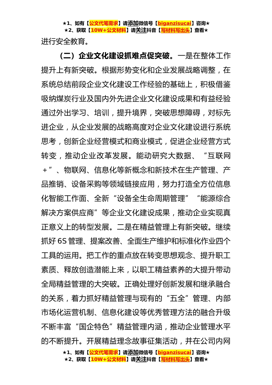★1、如有【公文代笔需求】请添加微信号【biganzisucai】咨询★★2、获取【10W+公文材料】请关注抖音【写材料写出头】查看★国有企业宣传思想文化工作2023年下半年打算(2548字)针对2023年上半年存在的问题不足,2023年下半年,公司将重点落实好“五抓五促”:(一)日常教育抓重点促实效。一是重点抓好党的二十大精神的学习宣传贯彻和主题教育组织开展。组织广大党员深入学习贯彻好党的二十大精神和习近平总书记系列重要讲话精神,严格执行好《党委理论中心组学习制度》制定下发两级党委中心组学习安排意见。围绕提高学习质量,积极探索创新学习形式,常态化办好过硬党支部论坛和合格党员讲坛,同时至少组织一次专家报告会、一次集中学习会。加强理论宣教基地建设,充分发挥理论骨干作用,广泛开展理论宣讲活动...