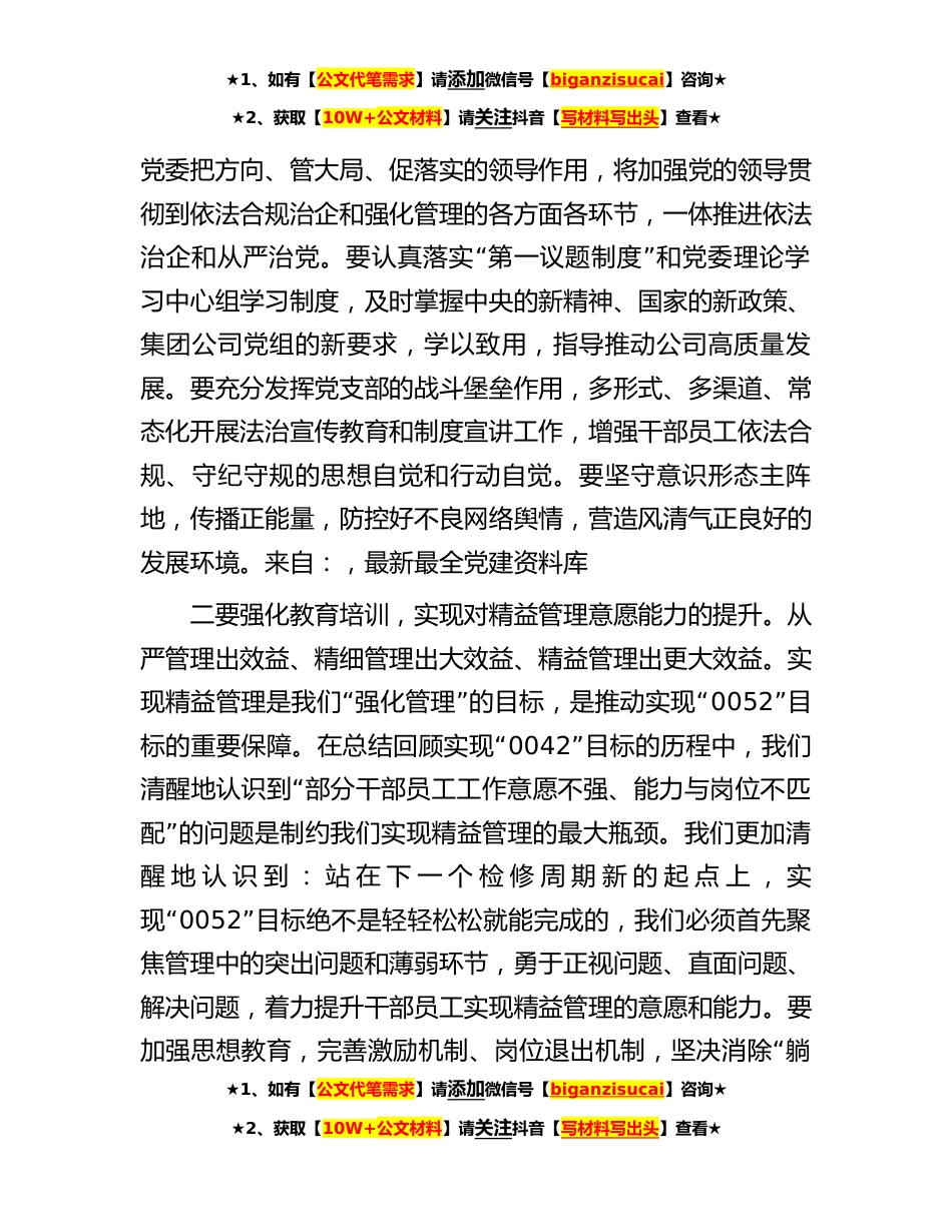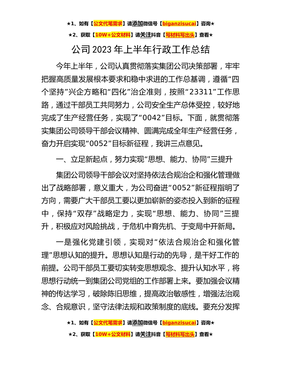 ★1、如有【公文代笔需求】请添加微信号【biganzisucai】咨询★★2、获取【10W+公文材料】请关注抖音【写材料写出头】查看★公司2023年上半年行政工作总结今年上半年,公司认真贯彻落实集团公司决策部署,牢牢“把握高质量发展根本要求和稳中求进的工作总基调,遵循四”“”“个坚持兴企方略和四化治企准则,按照23311”工作思路,通过干部员工共同努力,公司安全生产总体受控,较好地“完成了生产经营任务,实现了0042”目标。下面,就贯彻落实集团公司领导干部会议精神、圆满完成全年生产经营任务,“奋力开启实现0052”目标新征程,我讲三点意见。“”一、立足新起点,努力实现思想、能力、协同三提升集团公司领导干部会议对坚持依法合规治企和强化管理做“出了战略部署,意义重大,为公司奋进0052”新征程指明...