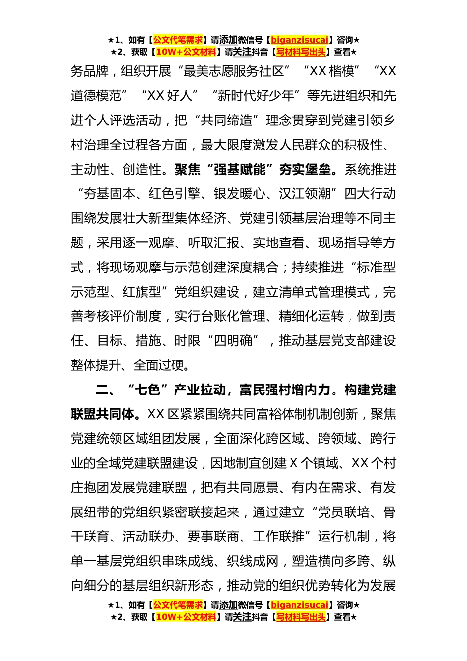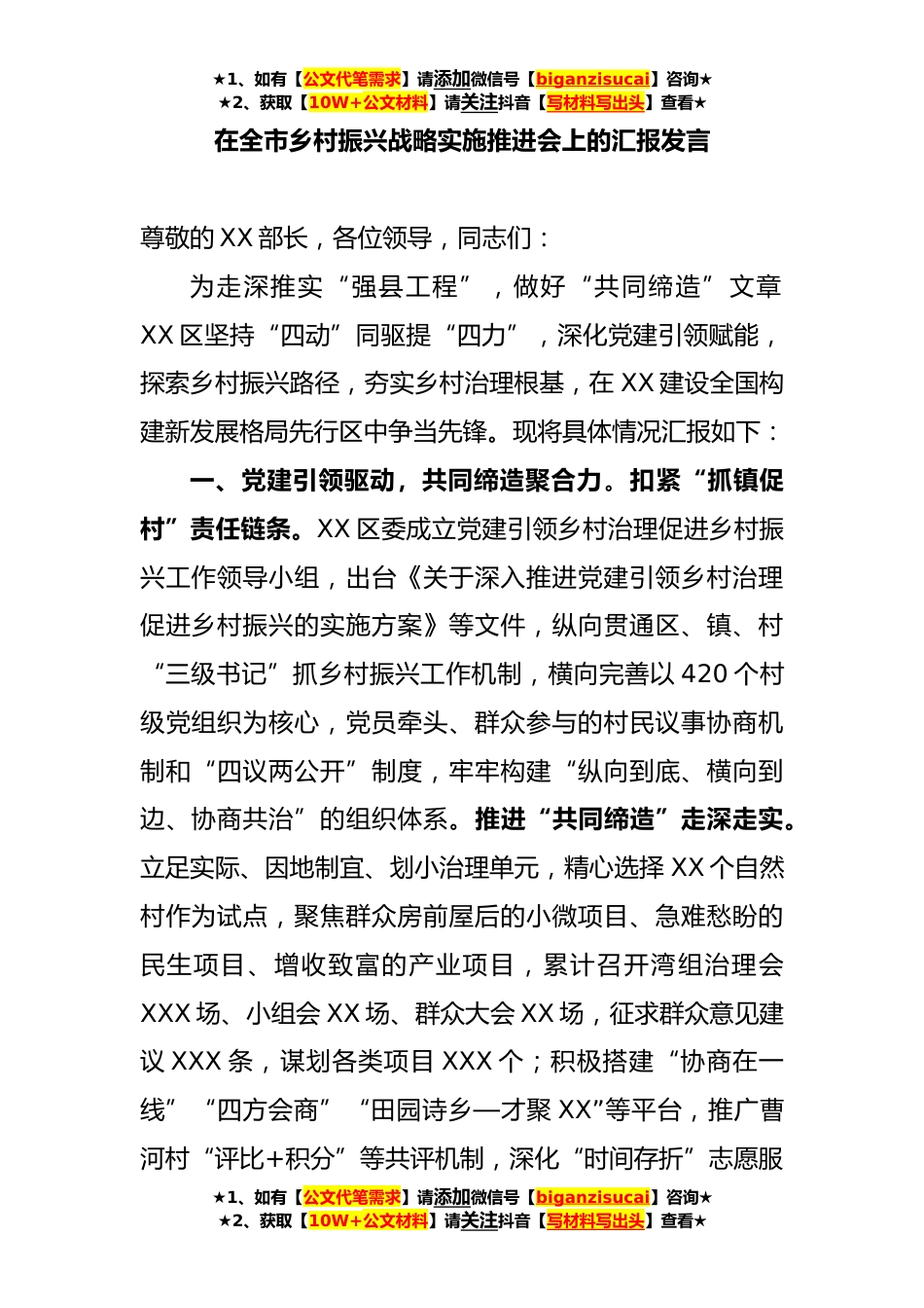 ★1、如有【公文代笔需求】请添加微信号【biganzisucai】咨询★★2、获取【10W+公文材料】请关注抖音【写材料写出头】查看★在全市乡村振兴战略实施推进会上的汇报发言尊敬的XX部长,各位领导,同志们:为走深推实“强县工程”,做好“共同缔造”文章XX区坚持“四动”同驱提“四力”,深化党建引领赋能,探索乡村振兴路径,夯实乡村治理根基,在XX建设全国构建新发展格局先行区中争当先锋。现将具体情况汇报如下:一、党建引领驱动,共同缔造聚合力。扣紧“抓镇促村”责任链条。XX区委成立党建引领乡村治理促进乡村振兴工作领导小组,出台《关于深入推进党建引领乡村治理促进乡村振兴的实施方案》等文件,纵向贯通区、镇、村“三级书记”抓乡村振兴工作机制,横向完善以420个村级党组织为核心,党员牵头、群众参与...