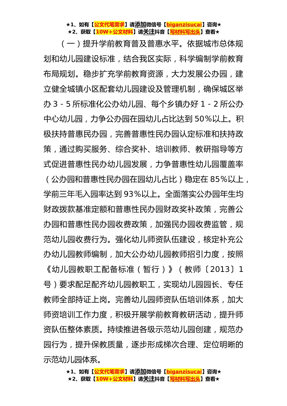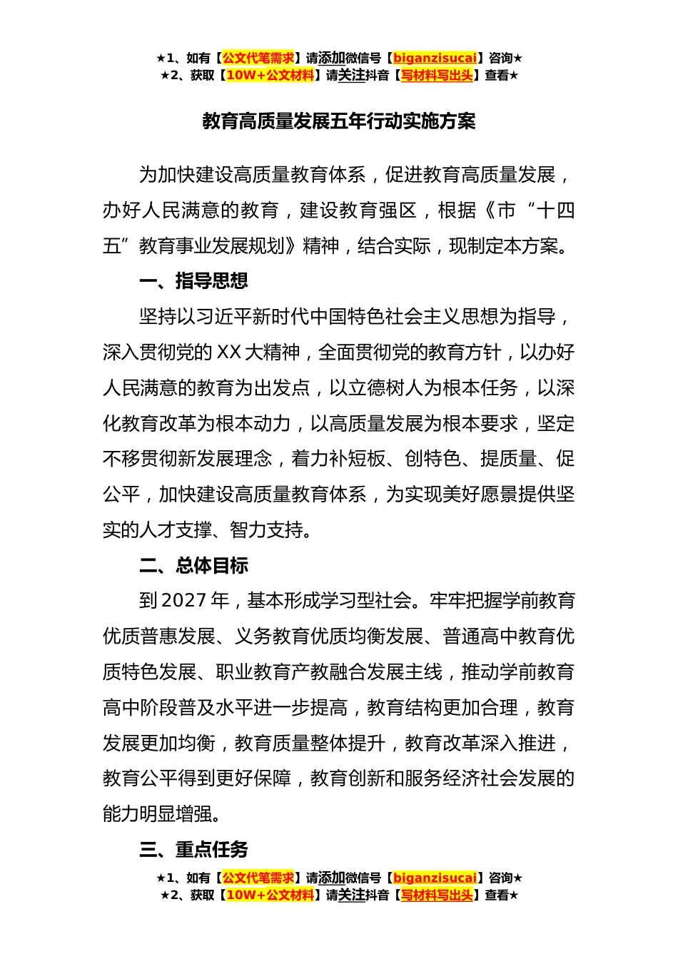 ★1、如有【公文代笔需求】请添加微信号【biganzisucai】咨询★★2、获取【10W+公文材料】请关注抖音【写材料写出头】查看★教育高质量发展五年行动实施方案为加快建设高质量教育体系,促进教育高质量发展,办好人民满意的教育,建设教育强区,根据《市“十四五”教育事业发展规划》精神,结合实际,现制定本方案。一、指导思想坚持以习近平新时代中国特色社会主义思想为指导,深入贯彻党的XX大精神,全面贯彻党的教育方针,以办好人民满意的教育为出发点,以立德树人为根本任务,以深化教育改革为根本动力,以高质量发展为根本要求,坚定不移贯彻新发展理念,着力补短板、创特色、提质量、促公平,加快建设高质量教育体系,为实现美好愿景提供坚实的人才支撑、智力支持。二、总体目标到2027年,基本形成学习型社...