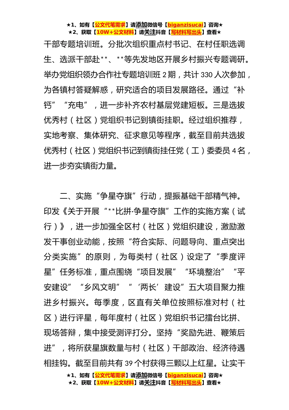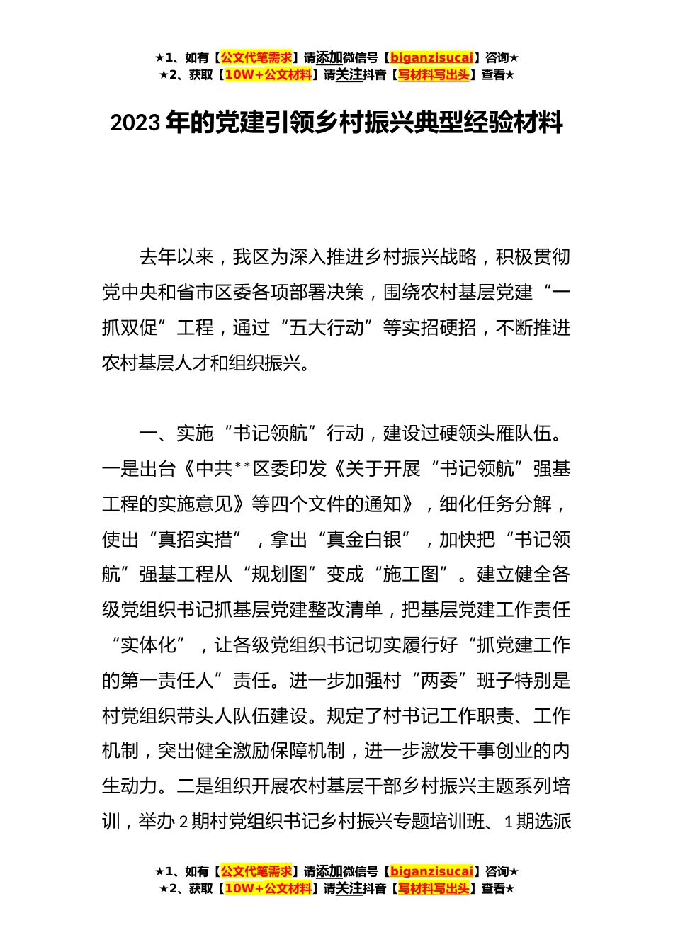 ★1、如有【公文代笔需求】请添加微信号【biganzisucai】咨询★★2、获取【10W+公文材料】请关注抖音【写材料写出头】查看★2023年的党建引领乡村振兴典型经验材料去年以来,我区为深入推进乡村振兴战略,积极贯彻党中央和省市区委各项部署决策,围绕农村基层党建“一抓双促”工程,通过“五大行动”等实招硬招,不断推进农村基层人才和组织振兴。一、实施“书记领航”行动,建设过硬领头雁队伍。一是出台《中共**区委印发《关于开展“书记领航”强基工程的实施意见》等四个文件的通知》,细化任务分解,使出“真招实措”,拿出“真金白银”,加快把“书记领航”强基工程从“规划图”变成“施工图”。建立健全各级党组织书记抓基层党建整改清单,把基层党建工作责任“实体化”,让各级党组织书记切实履行好“抓党...
