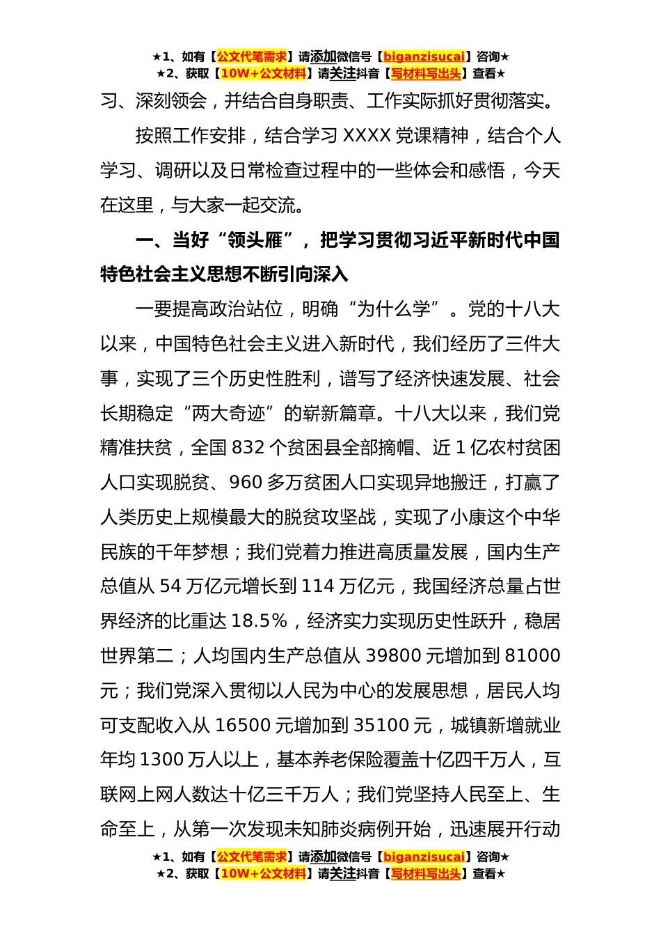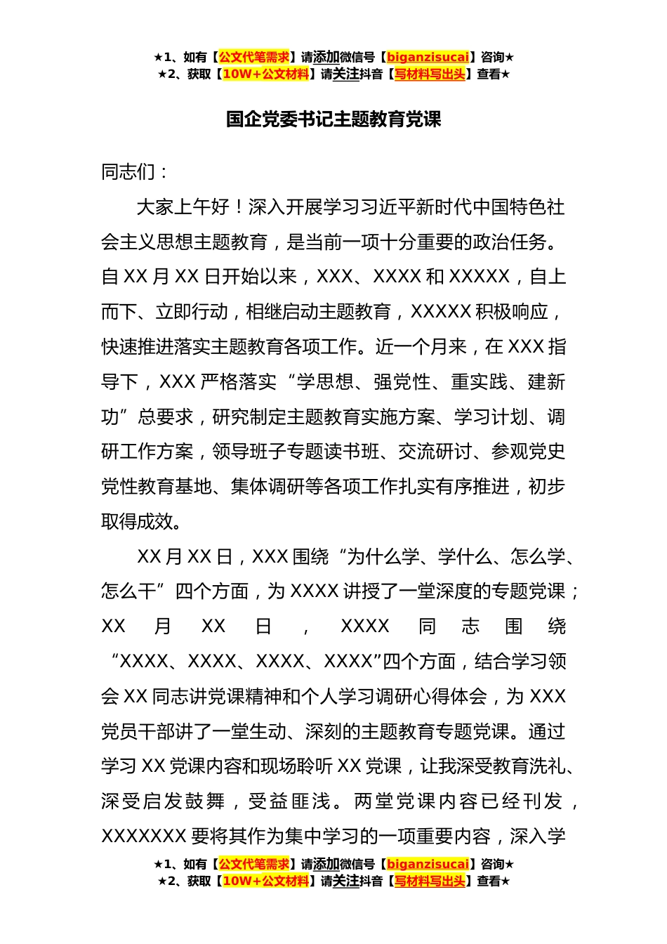 ★1、如有【公文代笔需求】请添加微信号【biganzisucai】咨询★★2、获取【10W+公文材料】请关注抖音【写材料写出头】查看★国企党委书记主题教育党课同志们:大家上午好!深入开展学习习近平新时代中国特色社会主义思想主题教育,是当前一项十分重要的政治任务。自XX月XX日开始以来,XXX、XXXX和XXXXX,自上而下、立即行动,相继启动主题教育,XXXXX积极响应,快速推进落实主题教育各项工作。近一个月来,在XXX指导下,XXX严格落实“学思想、强党性、重实践、建新功”总要求,研究制定主题教育实施方案、学习计划、调研工作方案,领导班子专题读书班、交流研讨、参观党史党性教育基地、集体调研等各项工作扎实有序推进,初步取得成效。XX月XX日,XXX围绕“为什么学、学什么、怎么学、怎么干”四个方面,为XXXX讲...