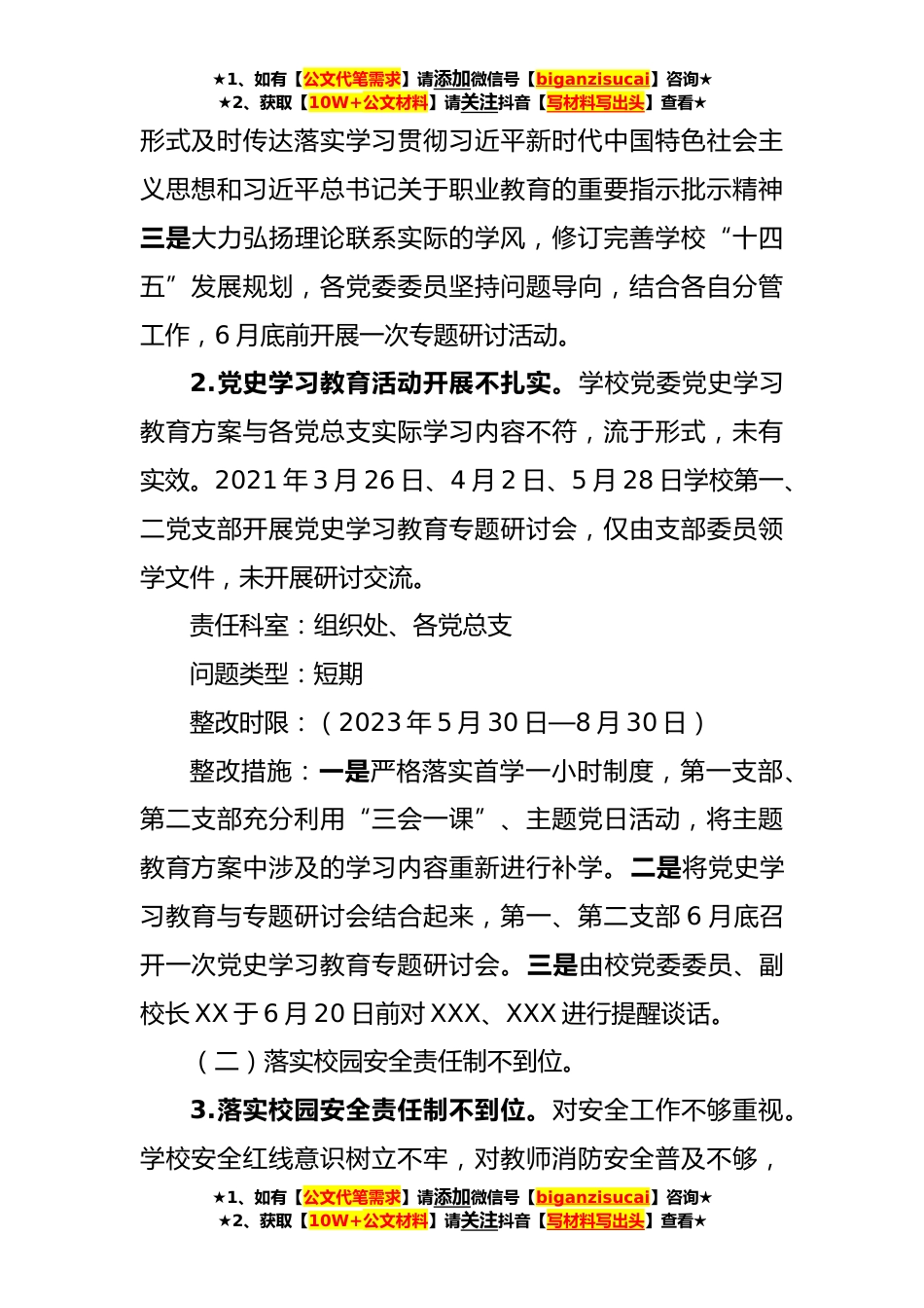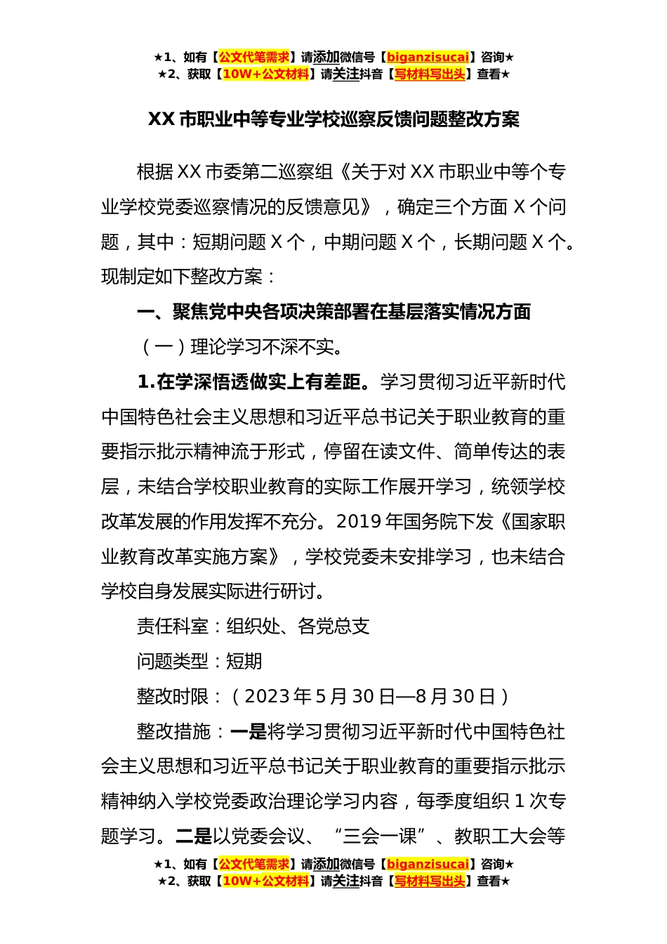 ★1、如有【公文代笔需求】请添加微信号【biganzisucai】咨询★★2、获取【10W+公文材料】请关注抖音【写材料写出头】查看★XX市职业中等专业学校巡察反馈问题整改方案根据XX市委第二巡察组《关于对XX市职业中等个专业学校党委巡察情况的反馈意见》,确定三个方面X个问题,其中:短期问题X个,中期问题X个,长期问题X个。现制定如下整改方案:一、聚焦党中央各项决策部署在基层落实情况方面(一)理论学习不深不实。1.在学深悟透做实上有差距。学习贯彻习近平新时代中国特色社会主义思想和习近平总书记关于职业教育的重要指示批示精神流于形式,停留在读文件、简单传达的表层,未结合学校职业教育的实际工作展开学习,统领学校改革发展的作用发挥不充分。2019年国务院下发《国家职业教育改革实施方案》,学校党委...
