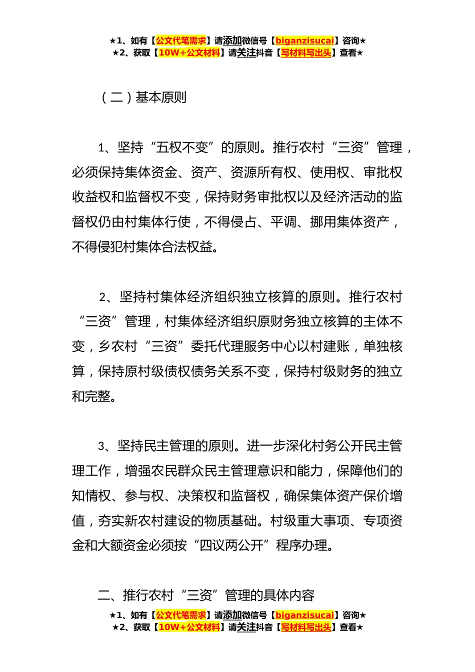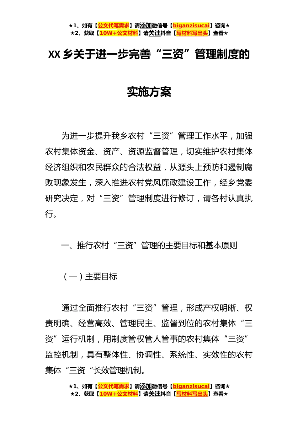 ★1、如有【公文代笔需求】请添加微信号【biganzisucai】咨询★★2、获取【10W+公文材料】请关注抖音【写材料写出头】查看★XX乡关于进一步完善“三资”管理制度的实施方案为进一步提升我乡农村“三资”管理工作水平,加强农村集体资金、资产、资源监督管理,切实维护农村集体经济组织和农民群众的合法权益,从源头上预防和遏制腐败现象发生,深入推进农村党风廉政建设工作,经乡党委研究决定,对“三资”管理制度进行修订,请各村认真执行。一、推行农村“三资”管理的主要目标和基本原则(一)主要目标通过全面推行农村“三资”管理,形成产权明晰、权责明确、经营高效、管理民主、监督到位的农村集体“三资”运行机制,用制度管权管人管事的农村集体“三资”监控机制,具有整体性、协调性、系统性、实效性的农...