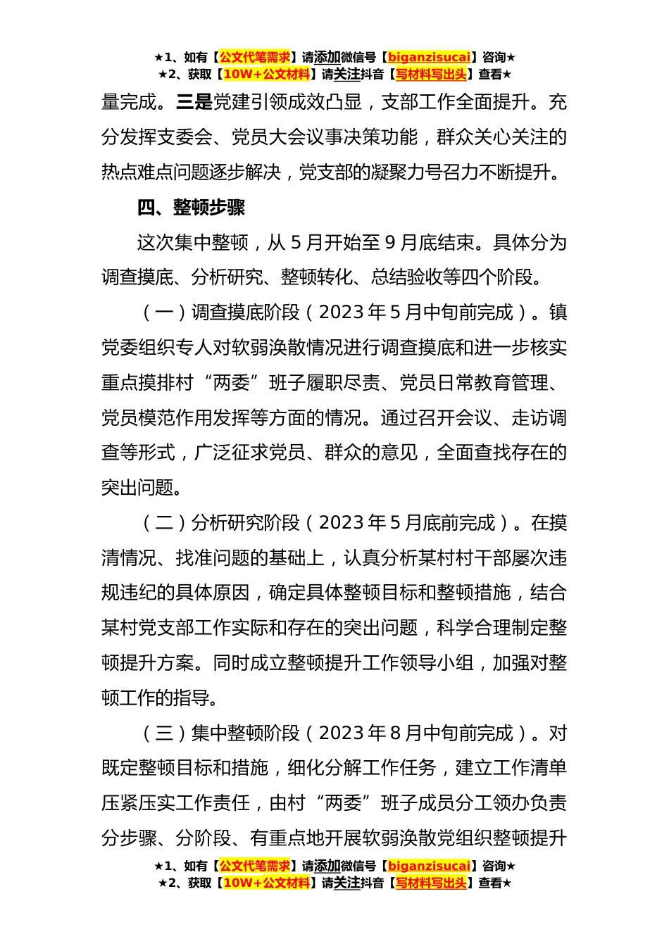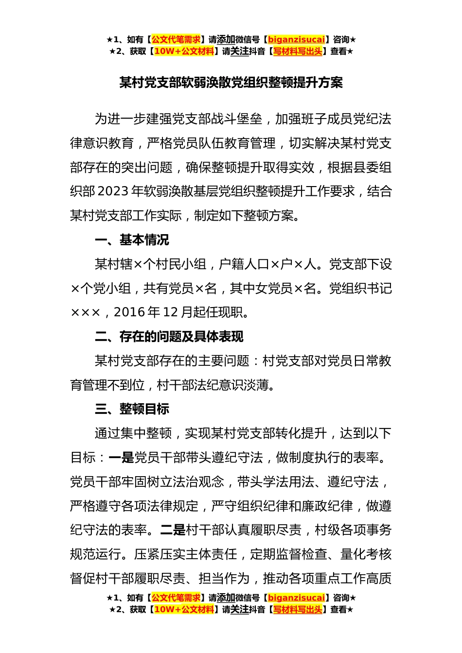 ★1、如有【公文代笔需求】请添加微信号【biganzisucai】咨询★★2、获取【10W+公文材料】请关注抖音【写材料写出头】查看★某村党支部软弱涣散党组织整顿提升方案为进一步建强党支部战斗堡垒,加强班子成员党纪法律意识教育,严格党员队伍教育管理,切实解决某村党支部存在的突出问题,确保整顿提升取得实效,根据县委组织部2023年软弱涣散基层党组织整顿提升工作要求,结合某村党支部工作实际,制定如下整顿方案。一、基本情况某村辖×个村民小组,户籍人口×户×人。党支部下设×个党小组,共有党员×名,其中女党员×名。党组织书记×××,2016年12月起任现职。二、存在的问题及具体表现某村党支部存在的主要问题:村党支部对党员日常教育管理不到位,村干部法纪意识淡薄。三、整顿目标通过集中整顿,实现某...
