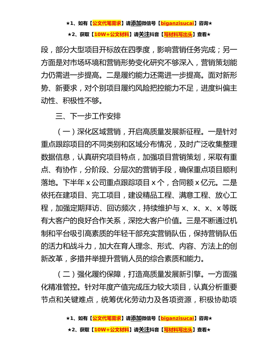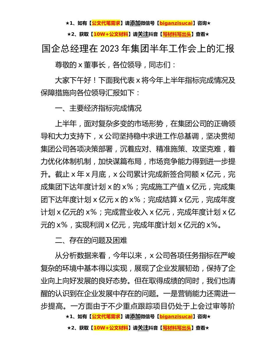★1、如有【公文代笔需求】请添加微信号【biganzisucai】咨询★★2、获取【10W+公文材料】请关注抖音【写材料写出头】查看★国企总经理在2023年集团半年工作会上的汇报尊敬的x董事长,各位领导,同志们:大家下午好!下面我代表x将今年上半年指标完成情况及保障措施向各位领导汇报如下:一、主要经济指标完成情况上半年,面对复杂多变的市场形势,在集团公司的正确领导和大力支持下,x公司坚持稳中求进工作总基调,坚决贯彻集团公司各项决策部署,沉着应对、精准施策、攻坚克难,着力优化体制机制,加快谋篇布局,市场竞争能力得到进一步提升。截止x年x月底,x公司累计完成新签合同额x亿元,完成集团下达年度计划x的x%;完成施工产值x亿元,完成集团下达年度计划x亿元x的x%;完成结算x亿元,完成年度计划x亿元的...