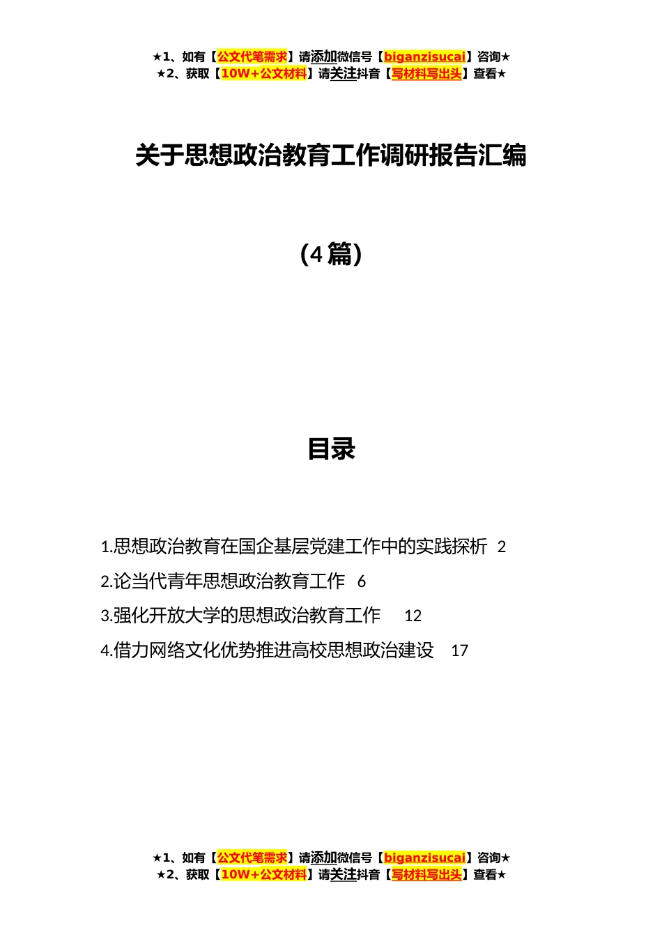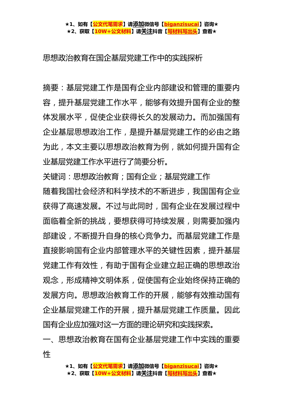 ★1、如有【公文代笔需求】请添加微信号【biganzisucai】咨询★★2、获取【10W+公文材料】请关注抖音【写材料写出头】查看★关于思想政治教育工作调研报告汇编(4篇)目录1.思想政治教育在国企基层党建工作中的实践探析22.论当代青年思想政治教育工作63.强化开放大学的思想政治教育工作124.借力网络文化优势推进高校思想政治建设17★1、如有【公文代笔需求】请添加微信号【biganzisucai】咨询★★2、获取【10W+公文材料】请关注抖音【写材料写出头】查看★★1、如有【公文代笔需求】请添加微信号【biganzisucai】咨询★★2、获取【10W+公文材料】请关注抖音【写材料写出头】查看★思想政治教育在国企基层党建工作中的实践探析摘要:基层党建工作是国有企业内部建设和管理的重要内容,提升基层党建工作水平,能够有...