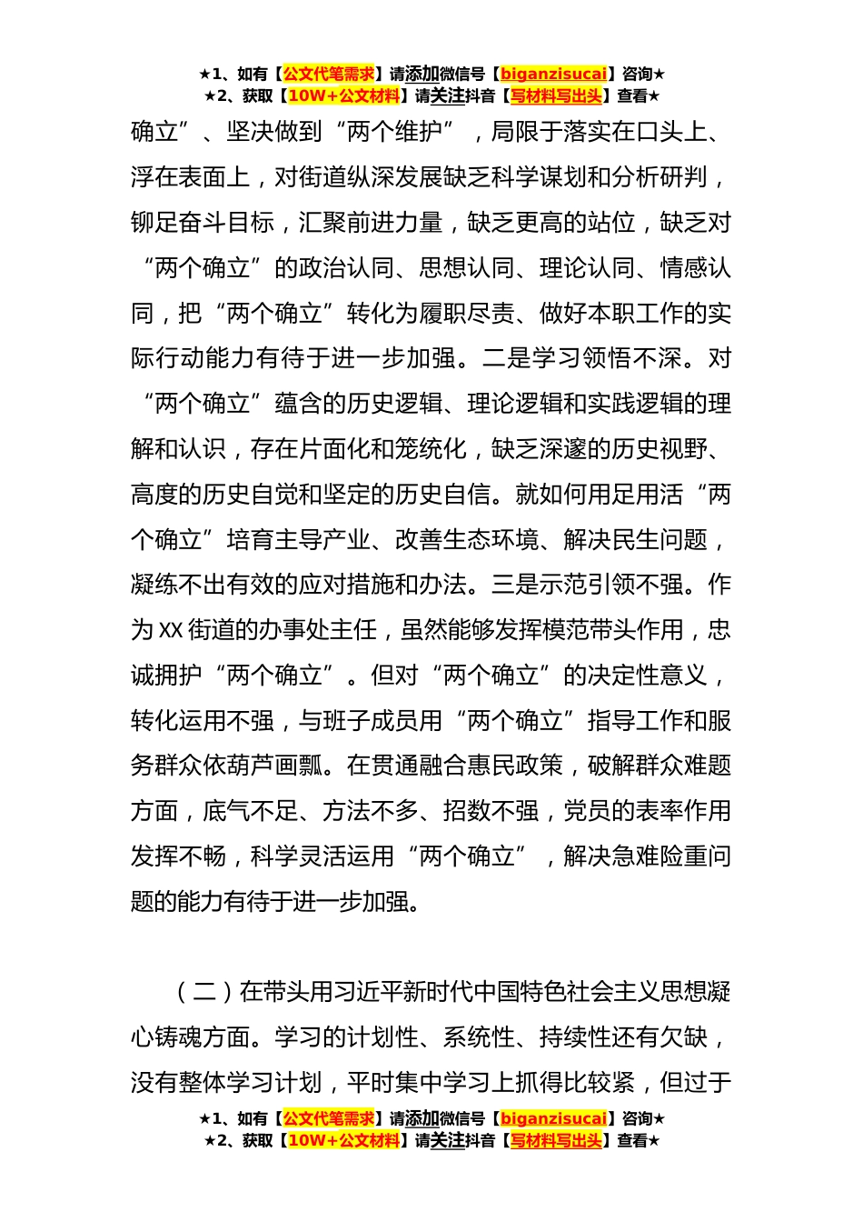 ★1、如有【公文代笔需求】请添加微信号【biganzisucai】咨询★★2、获取【10W+公文材料】请关注抖音【写材料写出头】查看★XX街道办事处主任在本年度民主生活会“六个带头”个人对照检查材料根据市委机关和市委组织部《关于认真开好2022年度科级党员领导干部民主生活会的通知》要求和安排,我全面学习了习近平新时代中国特色社会主义思想、习近平总书记系列重要讲话精神、《习近平谈治国理政》第四卷本等。结合个人思想、工作和生活实际,认真查找自身存在的问题,深入剖析产生问题的根源,现将个人对照检查汇报如下:一、存在的主要问题(一)带头深刻感悟“两个确立”的决定性意义,增强“四个意识”、坚定“四个自信”、做到“两个维护”方面。一是思考谋划不全。对“两个确立”的精神实质和丰富内涵思考不全...