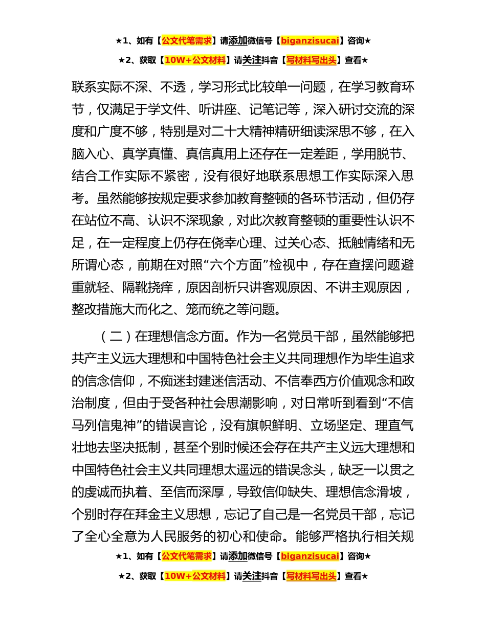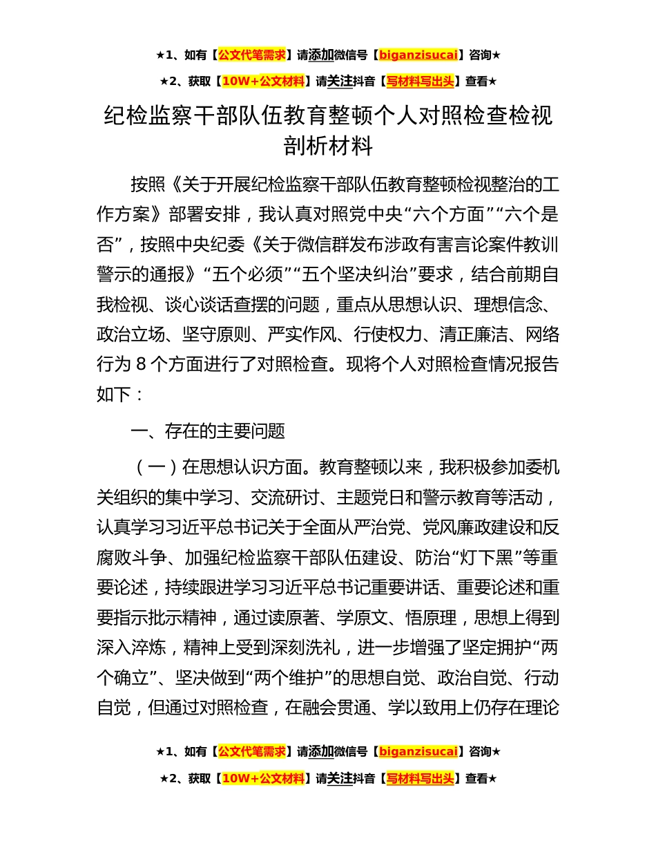 ★1、如有【公文代笔需求】请添加微信号【biganzisucai】咨询★★2、获取【10W+公文材料】请关注抖音【写材料写出头】查看★纪检监察干部队伍教育整顿个人对照检查检视剖析材料按照《关于开展纪检监察干部队伍教育整顿检视整治的工“作方案》部署安排,我认真对照党中央六个方面”“六个是”否,按照中央纪委《关于微信群发布涉政有害言论案件教训“”“”警示的通报》五个必须五个坚决纠治要求,结合前期自我检视、谈心谈话查摆的问题,重点从思想认识、理想信念、政治立场、坚守原则、严实作风、行使权力、清正廉洁、网络行为8个方面进行了对照检查。现将个人对照检查情况报告如下:一、存在的主要问题(一)在思想认识方面。教育整顿以来,我积极参加委机关组织的集中学习、交流研讨、主题党日和警示教育等活动...