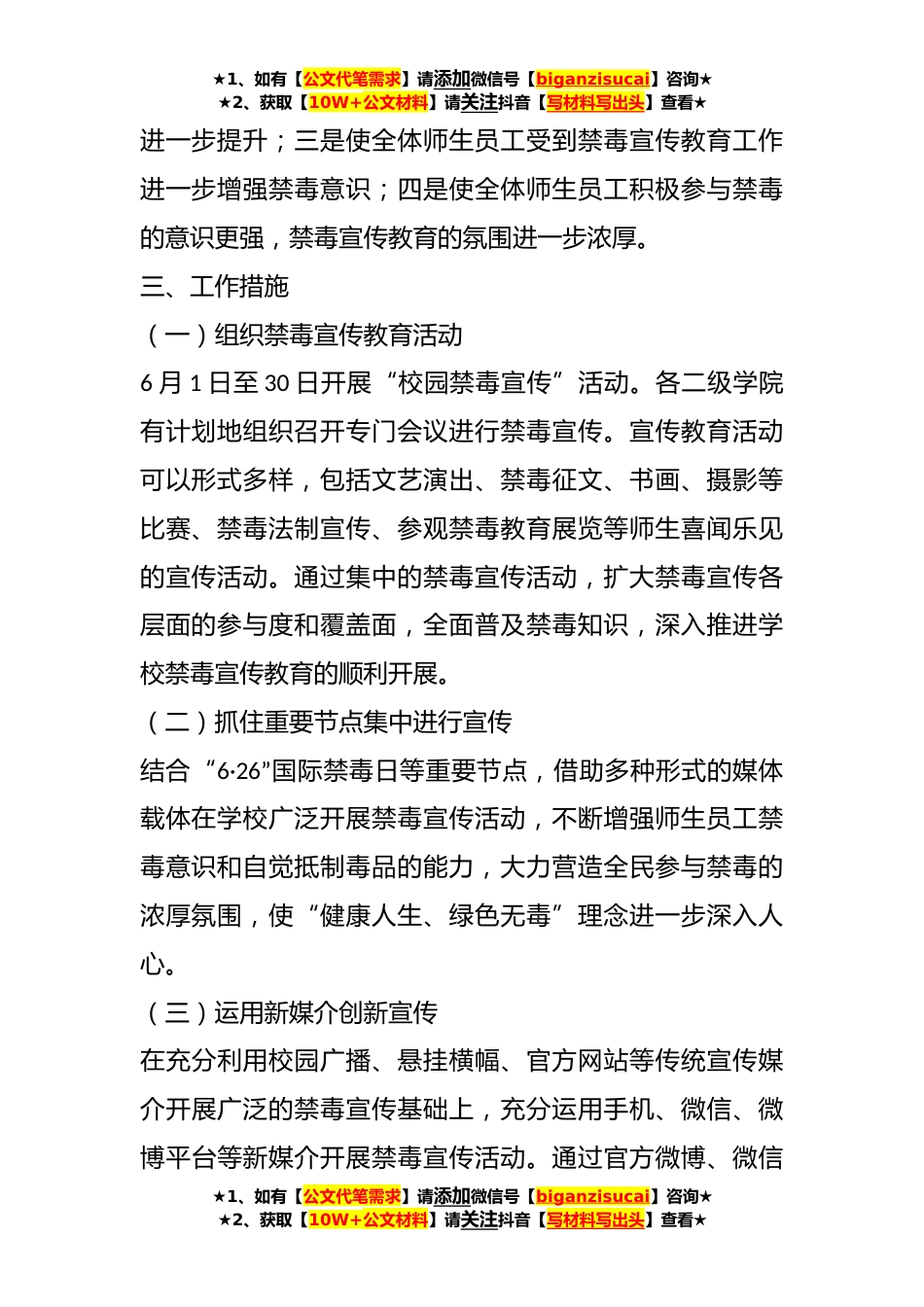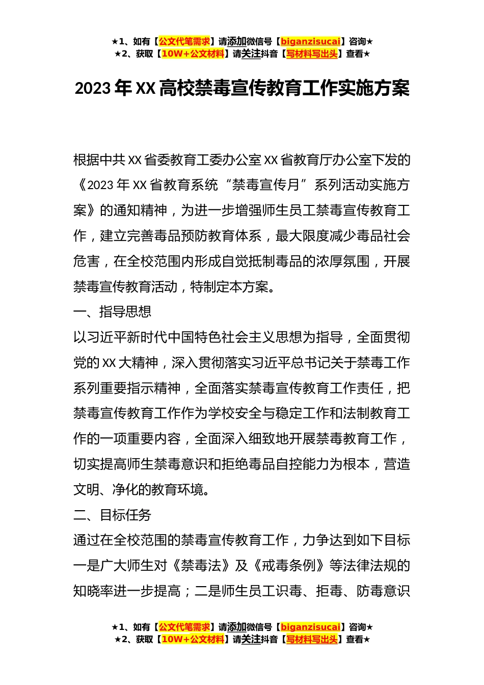 ★1、如有【公文代笔需求】请添加微信号【biganzisucai】咨询★★2、获取【10W+公文材料】请关注抖音【写材料写出头】查看★2023年XX高校禁毒宣传教育工作实施方案根据中共XX省委教育工委办公室XX省教育厅办公室下发的《2023年XX省教育系统“禁毒宣传月”系列活动实施方案》的通知精神,为进一步增强师生员工禁毒宣传教育工作,建立完善毒品预防教育体系,最大限度减少毒品社会危害,在全校范围内形成自觉抵制毒品的浓厚氛围,开展禁毒宣传教育活动,特制定本方案。一、指导思想以习近平新时代中国特色社会主义思想为指导,全面贯彻党的XX大精神,深入贯彻落实习近平总书记关于禁毒工作系列重要指示精神,全面落实禁毒宣传教育工作责任,把禁毒宣传教育工作作为学校安全与稳定工作和法制教育工作的一项重要内容,...