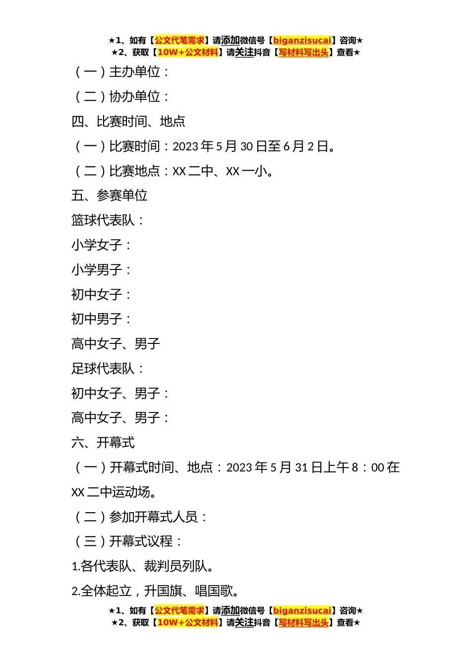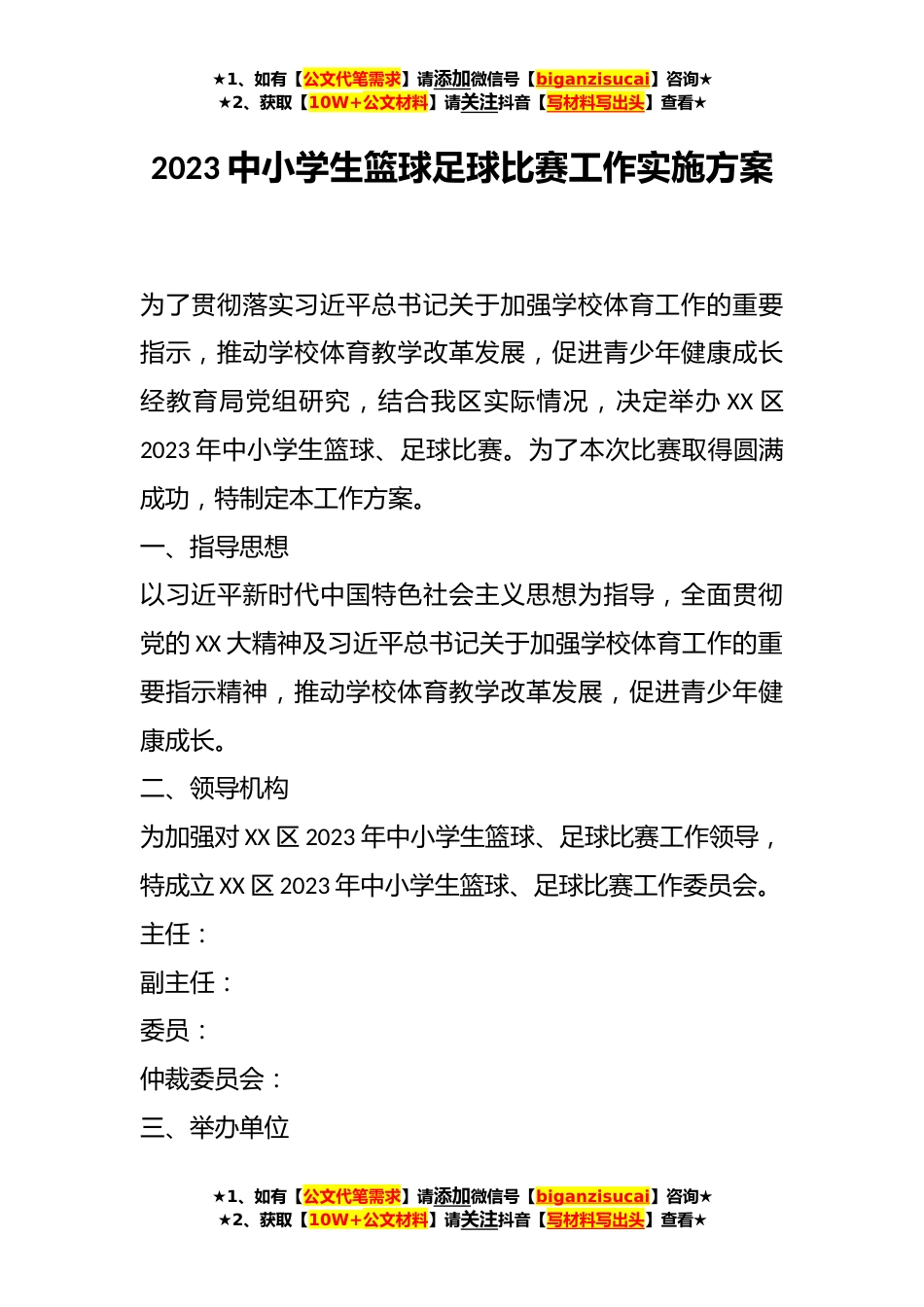 ★1、如有【公文代笔需求】请添加微信号【biganzisucai】咨询★★2、获取【10W+公文材料】请关注抖音【写材料写出头】查看★2023中小学生篮球足球比赛工作实施方案为了贯彻落实习近平总书记关于加强学校体育工作的重要指示,推动学校体育教学改革发展,促进青少年健康成长经教育局党组研究,结合我区实际情况,决定举办XX区2023年中小学生篮球、足球比赛。为了本次比赛取得圆满成功,特制定本工作方案。一、指导思想以习近平新时代中国特色社会主义思想为指导,全面贯彻党的XX大精神及习近平总书记关于加强学校体育工作的重要指示精神,推动学校体育教学改革发展,促进青少年健康成长。二、领导机构为加强对XX区2023年中小学生篮球、足球比赛工作领导,特成立XX区2023年中小学生篮球、足球比赛工作委员会。主任:...