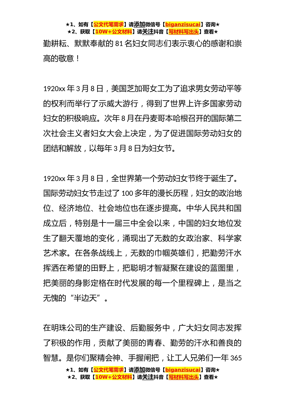 ★1、如有【公文代笔需求】请添加微信号【biganzisucai】咨询★★2、获取【10W+公文材料】请关注抖音【写材料写出头】查看★关于演讲赛领导讲话稿汇编(5篇)篇一女工同志们:春回大地,冰雪消融。在这万物峥嵘,祥龙抬头的美好时刻,我们明珠公司的女工同志们,今天欢聚一堂,庆祝“三〃八”国际劳动妇女节,追忆难忘的创业岁月,品味当前的幸福生活,畅想期待的美好未来。20xx年是我们明珠公司资源整合、安全生产、经营管理、文化建设等取得丰硕成果的一年,实现了90万吨建设项目的竣工验收,安全管理示范矿井建设,产量、进尺、利润税收均超额完成计划的三大目标,这些优异成绩有男同胞的一半,也有我们女同胞的一半,为此,我代表明珠公司向你们表示节日的祝贺和亲切的慰问!向在各个岗位上辛★1、如有【公文...