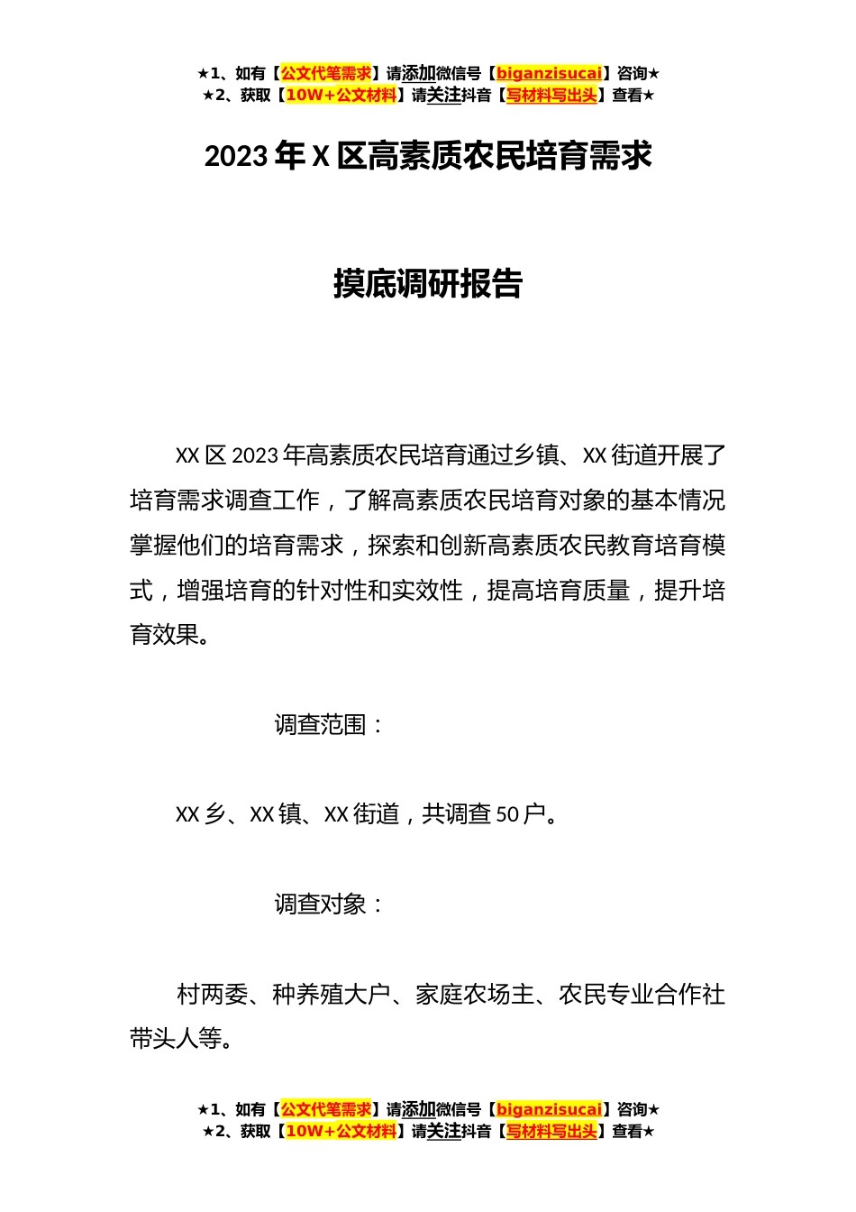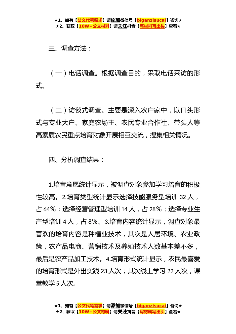 ★1、如有【公文代笔需求】请添加微信号【biganzisucai】咨询★★2、获取【10W+公文材料】请关注抖音【写材料写出头】查看★2023年X区高素质农民培育需求摸底调研报告XX区2023年高素质农民培育通过乡镇、XX街道开展了培育需求调查工作,了解高素质农民培育对象的基本情况掌握他们的培育需求,探索和创新高素质农民教育培育模式,增强培育的针对性和实效性,提高培育质量,提升培育效果。调查范围:XX乡、XX镇、XX街道,共调查50户。调查对象:村两委、种养殖大户、家庭农场主、农民专业合作社带头人等。★1、如有【公文代笔需求】请添加微信号【biganzisucai】咨询★★2、获取【10W+公文材料】请关注抖音【写材料写出头】查看★★1、如有【公文代笔需求】请添加微信号【biganzisucai】咨询★★2、获取【10W+公文材...