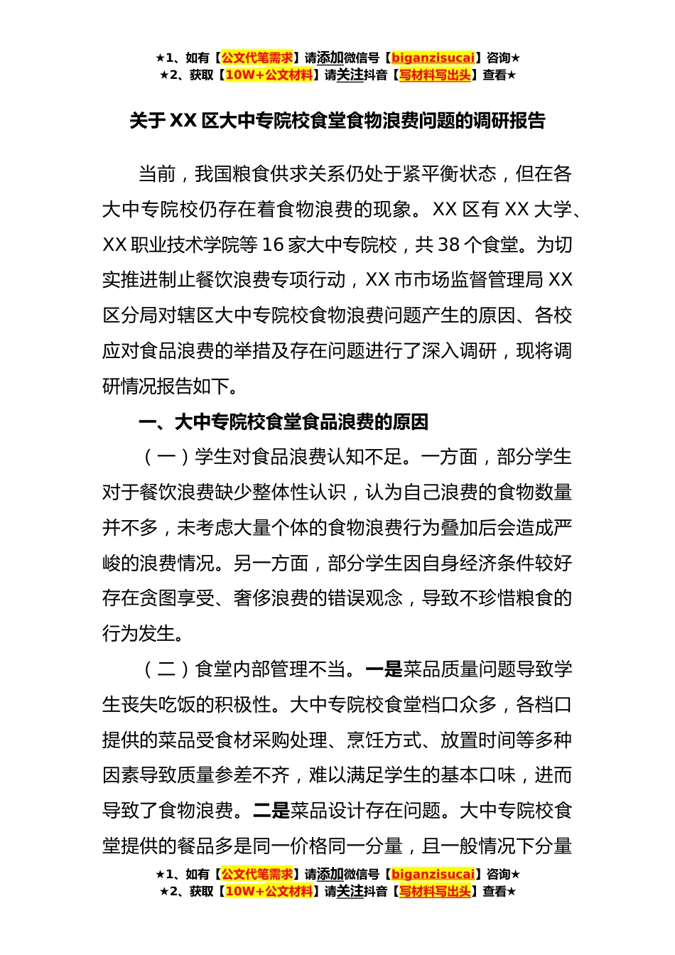 ★1、如有【公文代笔需求】请添加微信号【biganzisucai】咨询★★2、获取【10W+公文材料】请关注抖音【写材料写出头】查看★关于XX区大中专院校食堂食物浪费问题的调研报告当前,我国粮食供求关系仍处于紧平衡状态,但在各大中专院校仍存在着食物浪费的现象。XX区有XX大学、XX职业技术学院等16家大中专院校,共38个食堂。为切实推进制止餐饮浪费专项行动,XX市市场监督管理局XX区分局对辖区大中专院校食物浪费问题产生的原因、各校应对食品浪费的举措及存在问题进行了深入调研,现将调研情况报告如下。一、大中专院校食堂食品浪费的原因(一)学生对食品浪费认知不足。一方面,部分学生对于餐饮浪费缺少整体性认识,认为自己浪费的食物数量并不多,未考虑大量个体的食物浪费行为叠加后会造成严峻的浪费情况。另一...