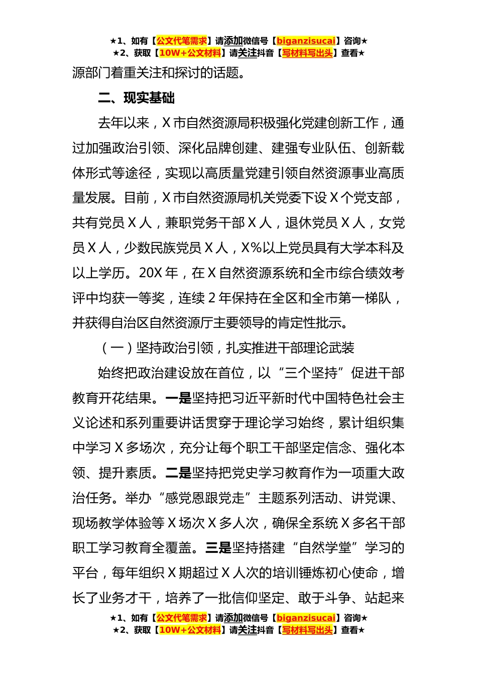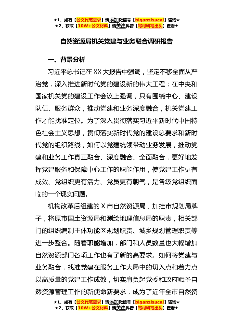 ★1、如有【公文代笔需求】请添加微信号【biganzisucai】咨询★★2、获取【10W+公文材料】请关注抖音【写材料写出头】查看★自然资源局机关党建与业务融合调研报告一、背景分析习近平总书记在XX大报告中强调,坚定不移全面从严治党,深入推进新时代党的建设新的伟大工程;在中央和国家机关党的建设工作会议上强调,只有围绕中心、建设队伍、服务群众,推动党建和业务深度融合,机关党建工作才能找准定位。为了深入贯彻落实习近平新时代中国特色社会主义思想,贯彻落实新时代党的建设总要求和新时代党的组织路线,如何以党建统领带动业务发展,推动党建和业务工作真正融合、深度融合、全面融合,更好地发挥党建服务和保障中心工作的职能作用,使党建工作更有成效、党组织更有活力、党员更有朝气,是各级党组织面临...
