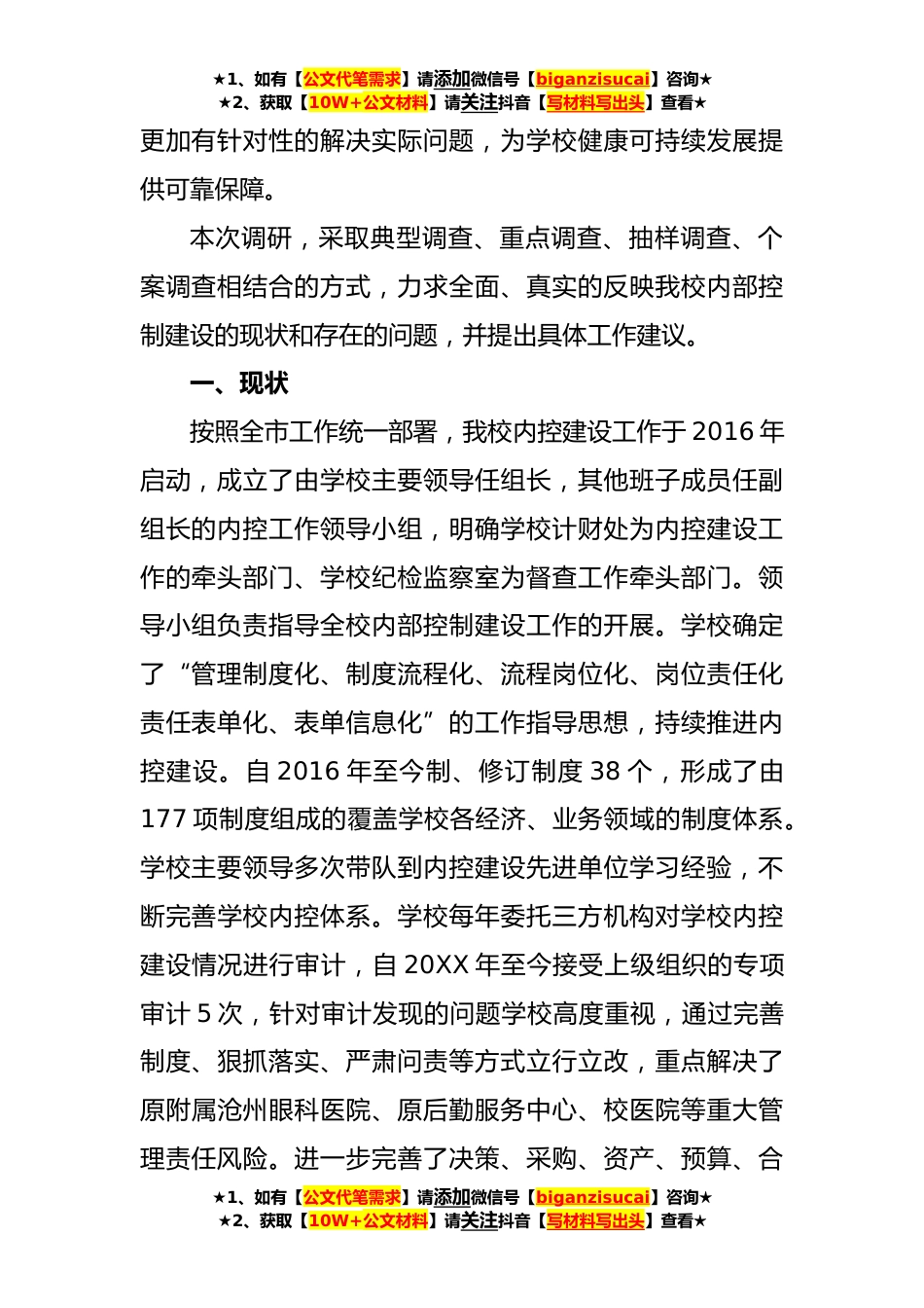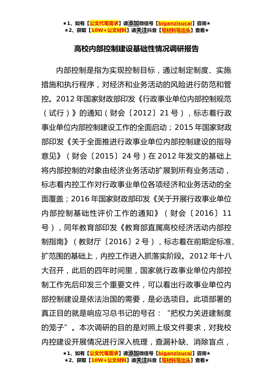 ★1、如有【公文代笔需求】请添加微信号【biganzisucai】咨询★★2、获取【10W+公文材料】请关注抖音【写材料写出头】查看★高校内部控制建设基础性情况调研报告内部控制是指为实现控制目标,通过制定制度、实施措施和执行程序,对经济和业务活动的风险进行防范和管控。2012年国家财政部印发《行政事业单位内部控制规范(试行)》的通知(财会〔2012〕21号),标志着行政事业单位内部控制建设工作的全面启动;2015年国家财政部印发《关于全面推进行政事业单位内部控制建设的指导意见》(财会〔2015〕24号)在2012年发文的基础上将内部控制的对象由经济业务活动扩展到所有业务活动,标志着内控工作对行政事业单位各项经济和业务活动的全面覆盖;2016年国家财政部印发《关于开展行政事业单位内部控制基础性评价工作...
