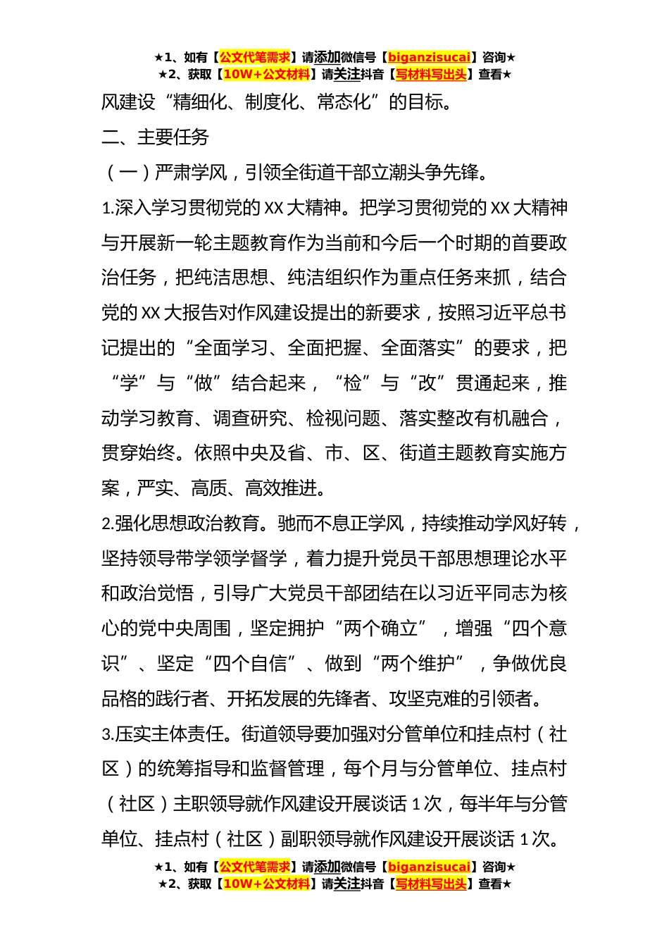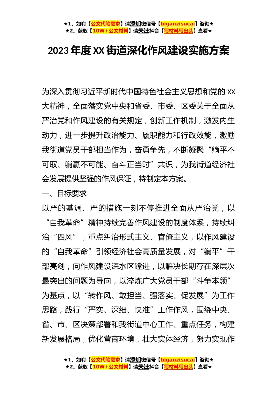 ★1、如有【公文代笔需求】请添加微信号【biganzisucai】咨询★★2、获取【10W+公文材料】请关注抖音【写材料写出头】查看★2023年度XX街道深化作风建设实施方案为深入贯彻习近平新时代中国特色社会主义思想和党的XX大精神,全面落实党中央和省委、市委、区委关于全面从严治党和作风建设的有关规定,创新工作机制,激发内生动力,进一步提升政治能力、履职能力和行政效能,激励我街道党员干部担当作为,奋勇争先,不断凝聚“躺平不可取、躺赢不可能、奋斗正当时”共识,为我街道经济社会发展提供坚强的作风保证,特制定本方案。一、目标要求以严的基调、严的措施一刻不停推进全面从严治党,以“自我革命”精神持续完善作风建设的制度体系,持续纠治“四风”,重点纠治形式主义、官僚主义,以作风建设的“自我革命...
