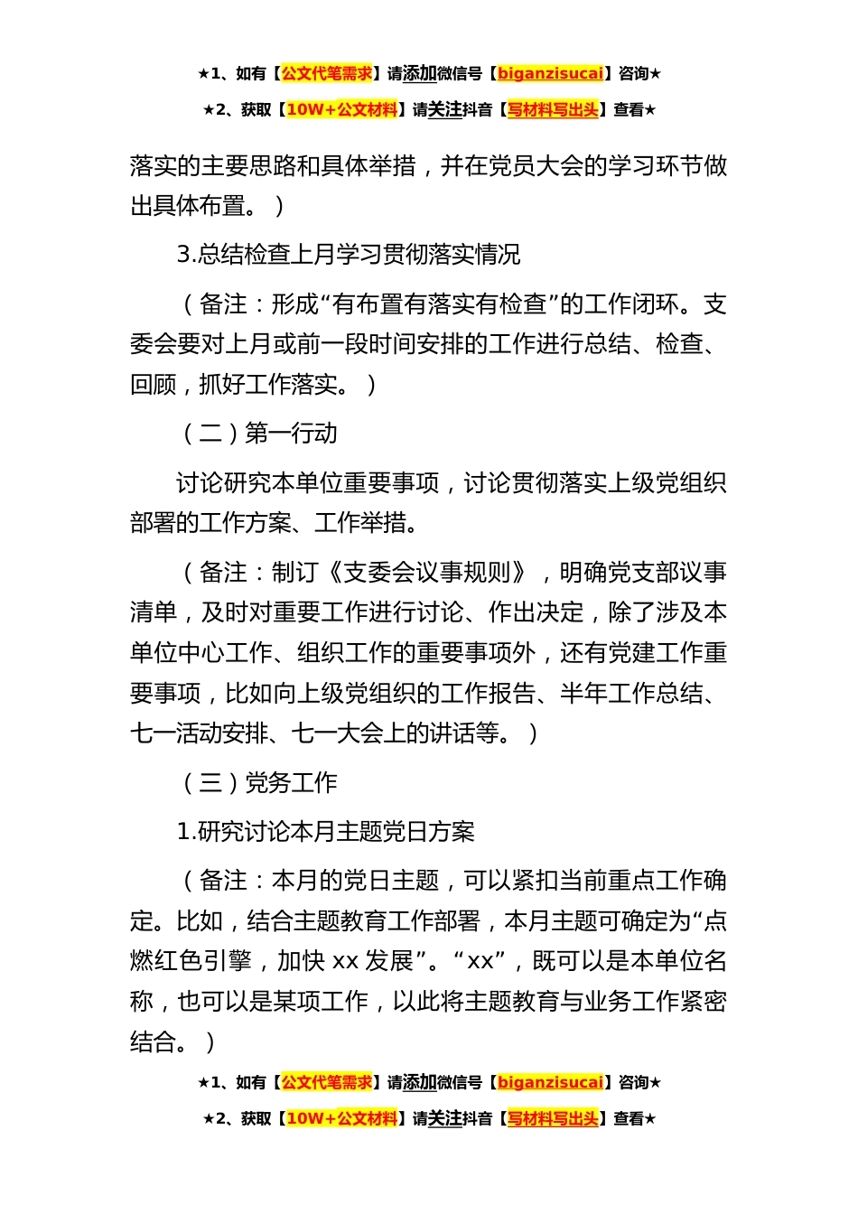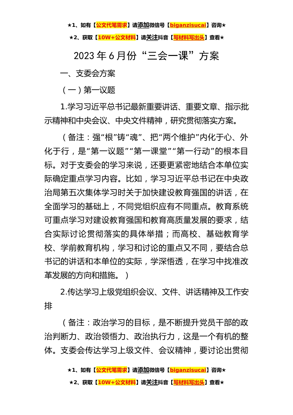 ★1、如有【公文代笔需求】请添加微信号【biganzisucai】咨询★★2、获取【10W+公文材料】请关注抖音【写材料写出头】查看★2023年6月份“三会一课”方案一、支委会方案(一)第一议题1.学习习近平总书记最新重要讲话、重要文章、指示批示精神和中央会议、中央文件精神,研究贯彻落实方案。“”“”“”(备注:强根铸魂、把两个维护内化于心、外“”“”“”化于行,是第一议题第一课堂第一行动的根本目标。对于支委会的学习来说,还要更紧密地结合本单位实际确定重点学习内容。比如,学习习近平总书记在中央政治局第五次集体学习时关于加快建设教育强国的讲话,在全面学习的基础上,不同党组织应有不同重点。教育系统可重点学习对建设教育强国和教育高质量发展的要求,结合实际讨论贯彻落实的具体举措;而高校、...