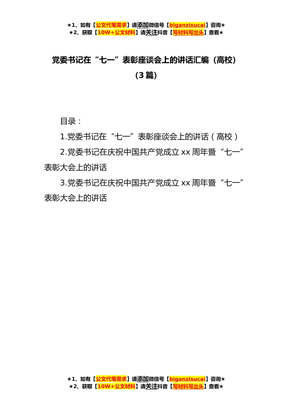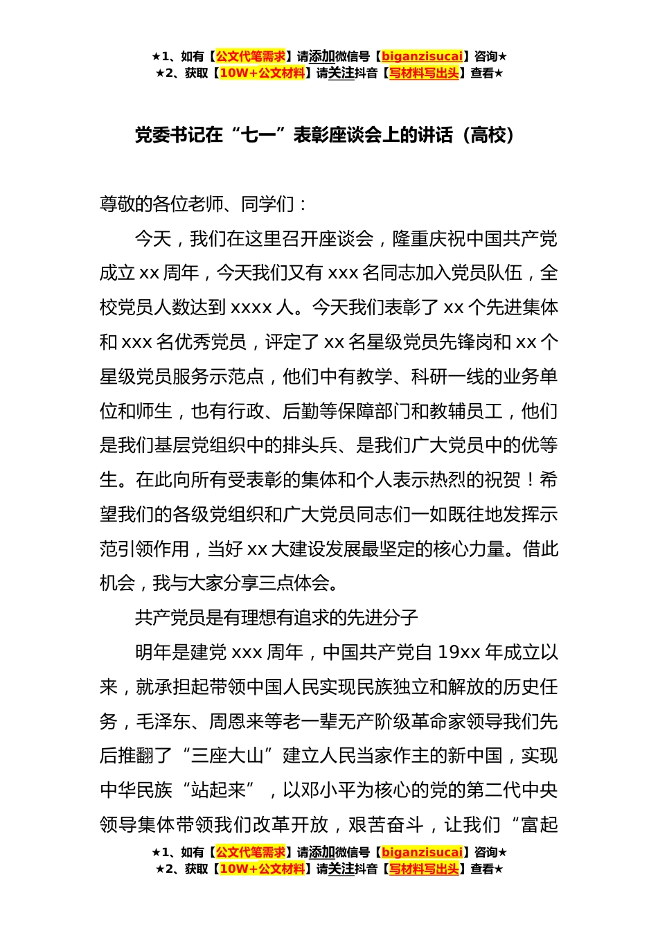 ★1、如有【公文代笔需求】请添加微信号【biganzisucai】咨询★★2、获取【10W+公文材料】请关注抖音【写材料写出头】查看★党委书记在“七一”表彰座谈会上的讲话汇编(高校)(3篇)目录:1.党委书记在“七一”表彰座谈会上的讲话(高校)2.党委书记在庆祝中国共产党成立xx周年暨“七一”表彰大会上的讲话3.党委书记在庆祝中国共产党成立xx周年暨“七一”表彰大会上的讲话★1、如有【公文代笔需求】请添加微信号【biganzisucai】咨询★★2、获取【10W+公文材料】请关注抖音【写材料写出头】查看★★1、如有【公文代笔需求】请添加微信号【biganzisucai】咨询★★2、获取【10W+公文材料】请关注抖音【写材料写出头】查看★党委书记在“七一”表彰座谈会上的讲话(高校)尊敬的各位老师、同学们:今天,我们在这里...