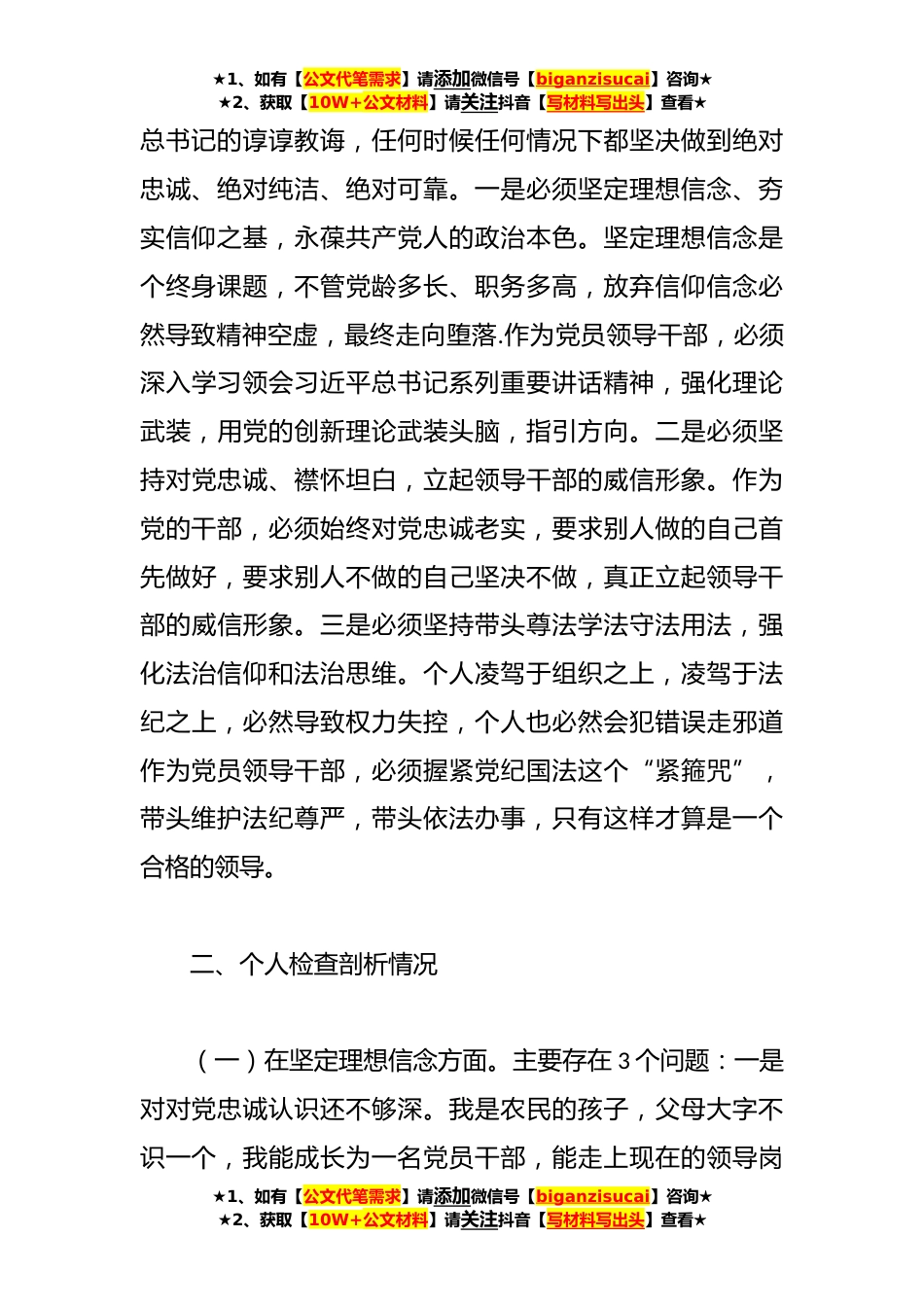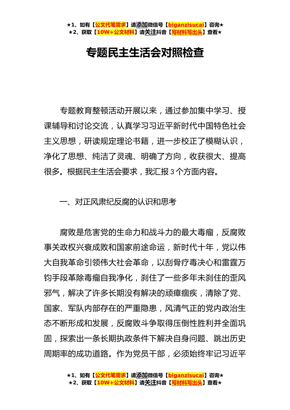 ★1、如有【公文代笔需求】请添加微信号【biganzisucai】咨询★★2、获取【10W+公文材料】请关注抖音【写材料写出头】查看★专题民主生活会对照检查专题教育整顿活动开展以来,通过参加集中学习、授课辅导和讨论交流,认真学习习近平新时代中国特色社会主义思想,研读规定理论书籍,进一步校正了模糊认识,净化了思想、纯洁了灵魂、明确了方向,收获很大、提高很多。根据民主生活会要求,我汇报3个方面内容。一、对正风肃纪反腐的认识和思考腐败是危害党的生命力和战斗力的最大毒瘤,反腐败事关政权兴衰成败和国家前途命运,新时代十年,党以伟大自我革命引领伟大社会革命,以刮骨疗毒决心和雷霆万钧手段革除毒瘤自我净化,刹住了一些多年未刹住的歪风邪气,解决了许多长期没有解决的顽瘴痼疾,清除了党、国家、军...
