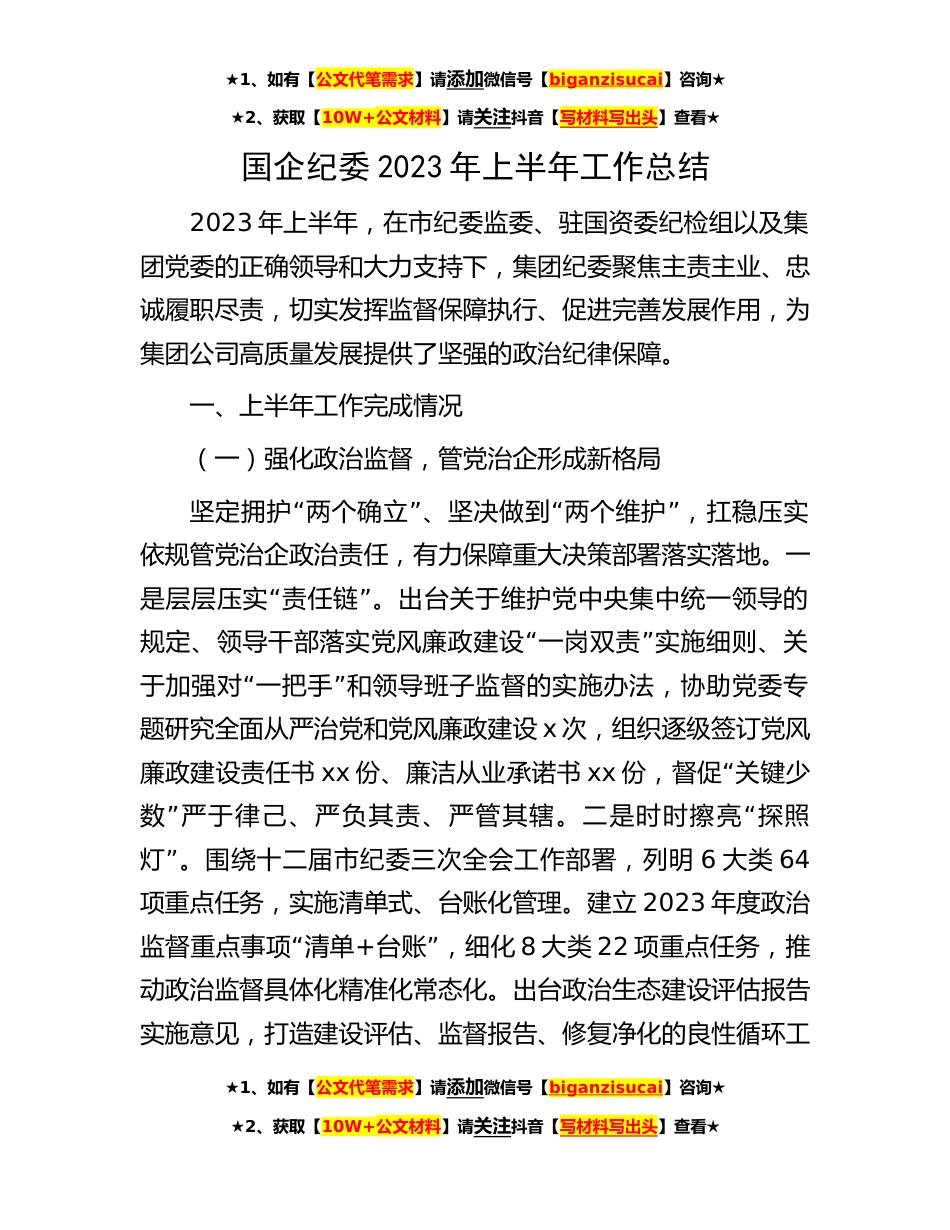 ★1、如有【公文代笔需求】请添加微信号【biganzisucai】咨询★★2、获取【10W+公文材料】请关注抖音【写材料写出头】查看★国企纪委2023年上半年工作总结2023年上半年,在市纪委监委、驻国资委纪检组以及集团党委的正确领导和大力支持下,集团纪委聚焦主责主业、忠诚履职尽责,切实发挥监督保障执行、促进完善发展作用,为集团公司高质量发展提供了坚强的政治纪律保障。一、上半年工作完成情况(一)强化政治监督,管党治企形成新格局“”“”坚定拥护两个确立、坚决做到两个维护,扛稳压实依规管党治企政治责任,有力保障重大决策部署落实落地。一“”是层层压实责任链。出台关于维护党中央集中统一领导的“”规定、领导干部落实党风廉政建设一岗双责实施细则、关“”于加强对一把手和领导班子监督的实施办法,...