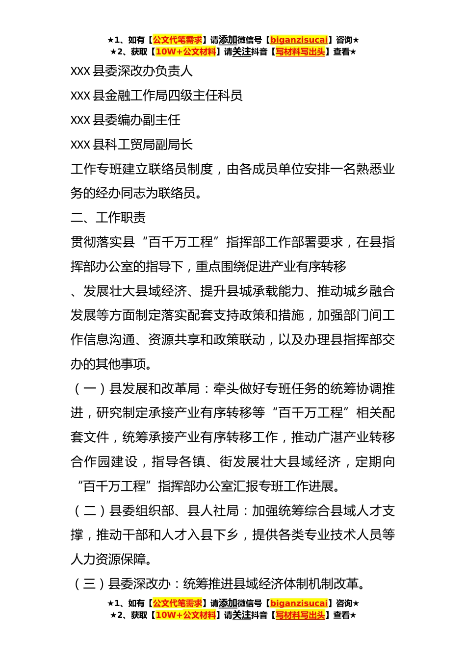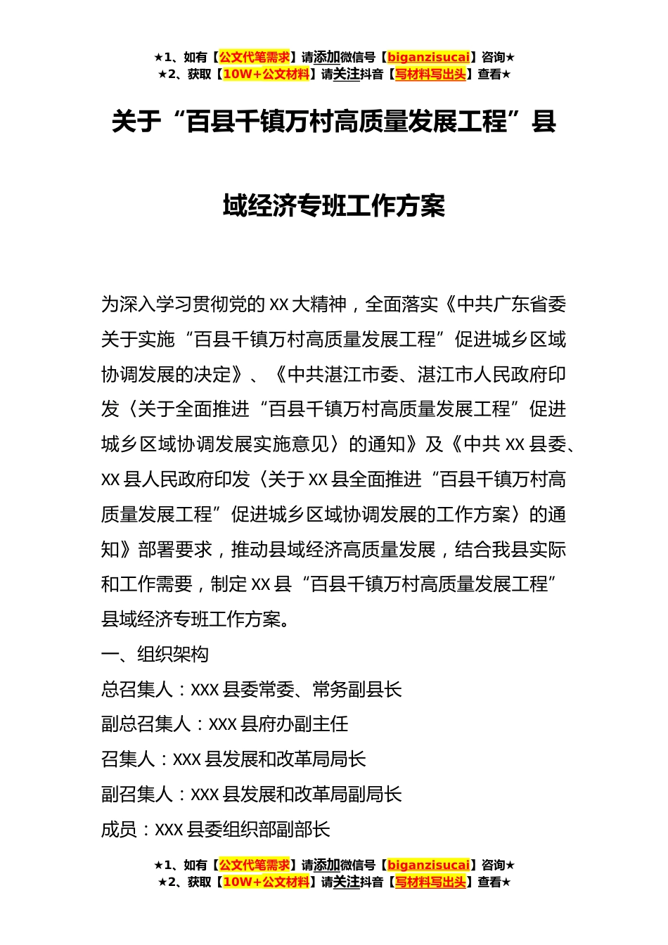 ★1、如有【公文代笔需求】请添加微信号【biganzisucai】咨询★★2、获取【10W+公文材料】请关注抖音【写材料写出头】查看★关于“百县千镇万村高质量发展工程”县域经济专班工作方案为深入学习贯彻党的XX大精神,全面落实《中共广东省委关于实施“百县千镇万村高质量发展工程”促进城乡区域协调发展的决定》、《中共湛江市委、湛江市人民政府印发〈关于全面推进“百县千镇万村高质量发展工程”促进城乡区域协调发展实施意见〉的通知》及《中共XX县委、XX县人民政府印发〈关于XX县全面推进“百县千镇万村高质量发展工程”促进城乡区域协调发展的工作方案〉的通知》部署要求,推动县域经济高质量发展,结合我县实际和工作需要,制定XX县“百县千镇万村高质量发展工程”县域经济专班工作方案。一、组织架构总召集人...