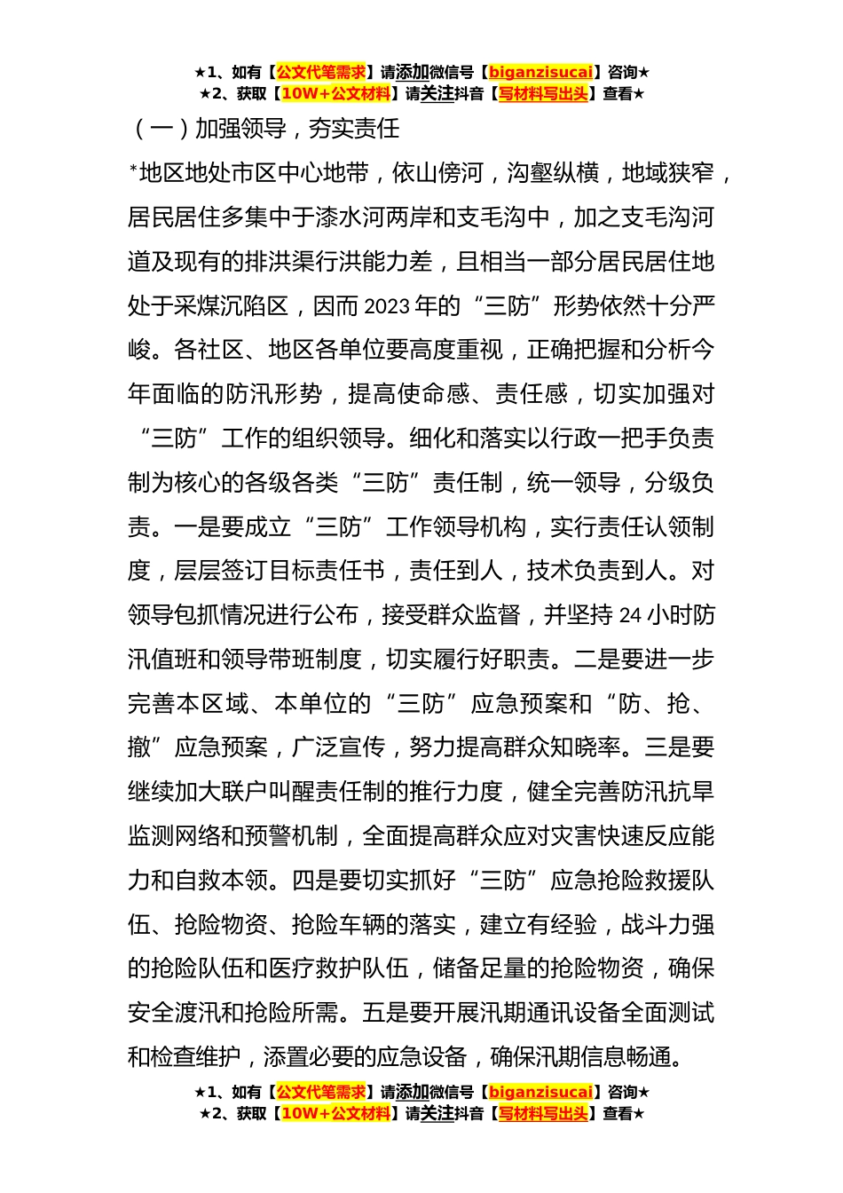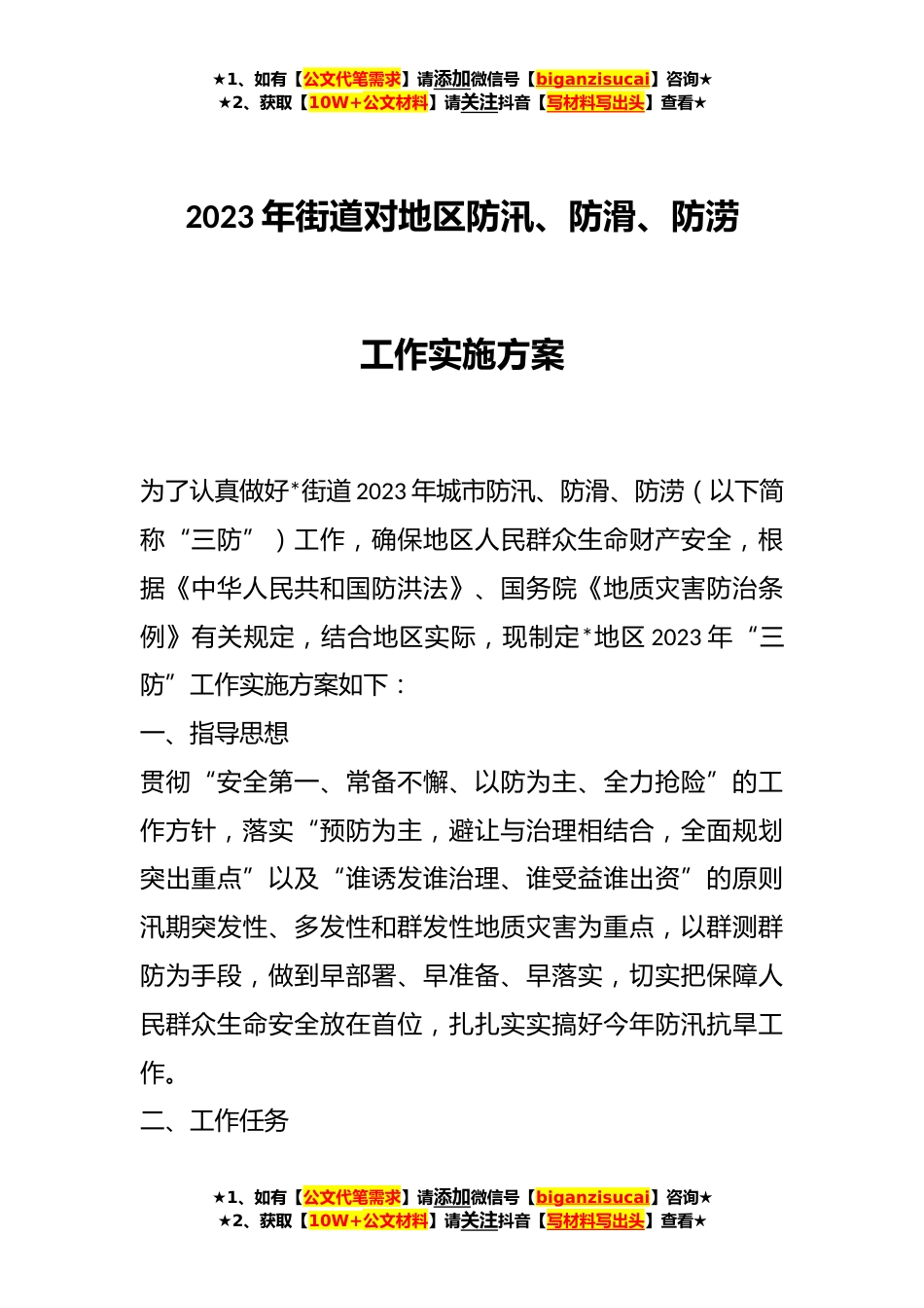 ★1、如有【公文代笔需求】请添加微信号【biganzisucai】咨询★★2、获取【10W+公文材料】请关注抖音【写材料写出头】查看★2023年街道对地区防汛、防滑、防涝工作实施方案为了认真做好*街道2023年城市防汛、防滑、防涝(以下简称“三防”)工作,确保地区人民群众生命财产安全,根据《中华人民共和国防洪法》、国务院《地质灾害防治条例》有关规定,结合地区实际,现制定*地区2023年“三防”工作实施方案如下:一、指导思想贯彻“安全第一、常备不懈、以防为主、全力抢险”的工作方针,落实“预防为主,避让与治理相结合,全面规划突出重点”以及“谁诱发谁治理、谁受益谁出资”的原则汛期突发性、多发性和群发性地质灾害为重点,以群测群防为手段,做到早部署、早准备、早落实,切实把保障人民群众生命安全放在...