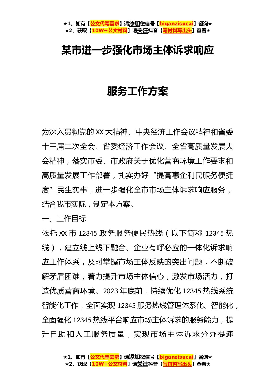 ★1、如有【公文代笔需求】请添加微信号【biganzisucai】咨询★★2、获取【10W+公文材料】请关注抖音【写材料写出头】查看★某市进一步强化市场主体诉求响应服务工作方案为深入贯彻党的XX大精神、中央经济工作会议精神和省委十三届二次全会、省委经济工作会议、全省高质量发展大会精神,落实市委、市政府关于优化营商环境工作要求和高质量发展工作部署,扎实办好“提高惠企利民服务便捷度”民生实事,进一步强化全市市场主体诉求响应服务,结合我市实际,制定本方案。一、工作目标依托XX市12345政务服务便民热线(以下简称12345热线),建立线上线下融合、企业有呼必应的一体化诉求响应工作体系,及时掌握市场主体反映的突出问题,不断破解矛盾困难,着力提升市场主体信心,激发市场活力,打造优质营商环境。2023...