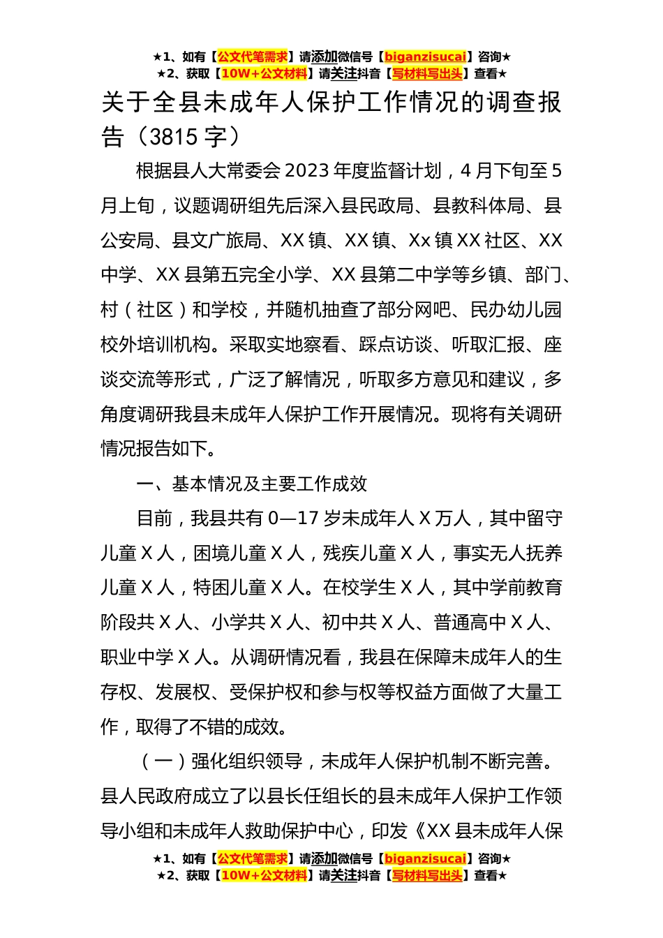 ★1、如有【公文代笔需求】请添加微信号【biganzisucai】咨询★★2、获取【10W+公文材料】请关注抖音【写材料写出头】查看★关于全县未成年人保护工作情况的调查报告(3815字)根据县人大常委会2023年度监督计划,4月下旬至5月上旬,议题调研组先后深入县民政局、县教科体局、县公安局、县文广旅局、XX镇、XX镇、Xx镇XX社区、XX中学、XX县第五完全小学、XX县第二中学等乡镇、部门、村(社区)和学校,并随机抽查了部分网吧、民办幼儿园校外培训机构。采取实地察看、踩点访谈、听取汇报、座谈交流等形式,广泛了解情况,听取多方意见和建议,多角度调研我县未成年人保护工作开展情况。现将有关调研情况报告如下。一、基本情况及主要工作成效目前,我县共有0—17岁未成年人X万人,其中留守儿童X人,困境儿童X人,残...