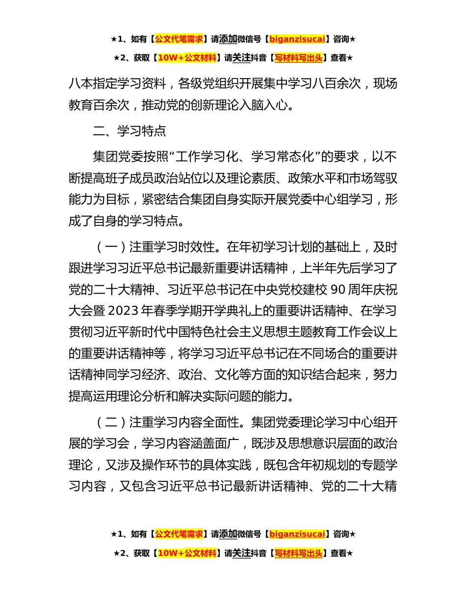 ★1、如有【公文代笔需求】请添加微信号【biganzisucai】咨询★★2、获取【10W+公文材料】请关注抖音【写材料写出头】查看★2023年上半年,x党委坚持以习近平新时代中国特色社会主义思想为指导,深入学习贯彻党的二十大精神,把握中心“”组学习学理论、阔思路、议大事、谋实策的功能定位,紧紧围绕中心工作,不断创新工作思路,持续提高党建和经营管理工作水平,为集团的发展提供了强大的精神动力、智力支持和思想保证。一、上半年学习情况(一)加强顶层设计。集团党委认真落实党中央决策部署和上级党委工作要求,围绕集团党建和经营管理工作,采取自主学习与集中学习相结合、个人自学与专家辅导相结合、学习理论与调查研究、解决实际问题相结合等方式,坚持理论联系实际,科学制定学习计划,明确安排14个学习专...