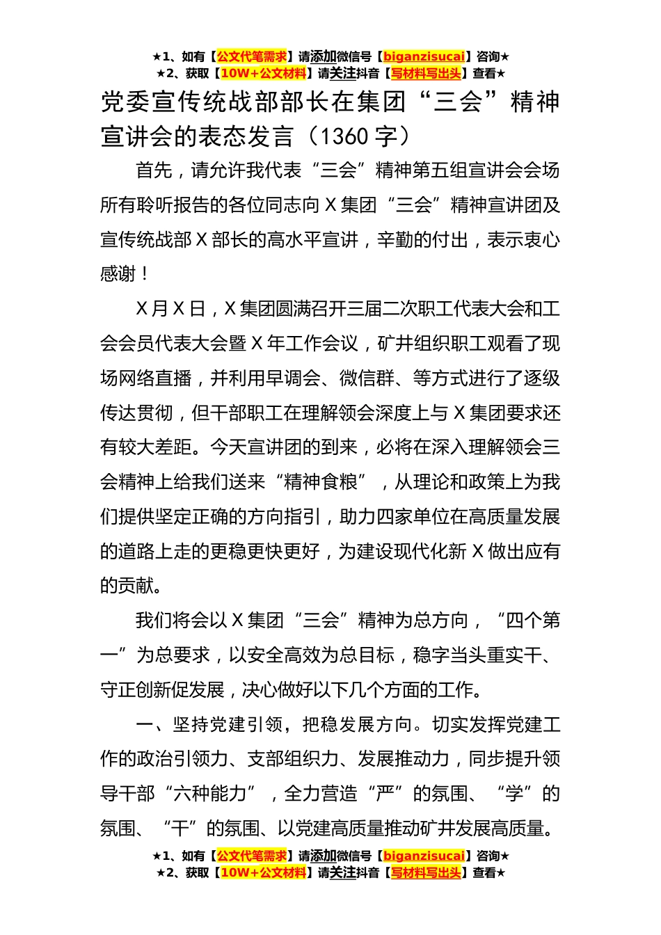 ★1、如有【公文代笔需求】请添加微信号【biganzisucai】咨询★★2、获取【10W+公文材料】请关注抖音【写材料写出头】查看★党委宣传统战部部长在集团“三会”精神宣讲会的表态发言(1360字)首先,请允许我代表“三会”精神第五组宣讲会会场所有聆听报告的各位同志向X集团“三会”精神宣讲团及宣传统战部X部长的高水平宣讲,辛勤的付出,表示衷心感谢!X月X日,X集团圆满召开三届二次职工代表大会和工会会员代表大会暨X年工作会议,矿井组织职工观看了现场网络直播,并利用早调会、微信群、等方式进行了逐级传达贯彻,但干部职工在理解领会深度上与X集团要求还有较大差距。今天宣讲团的到来,必将在深入理解领会三会精神上给我们送来“精神食粮”,从理论和政策上为我们提供坚定正确的方向指引,助力四家单位在高...